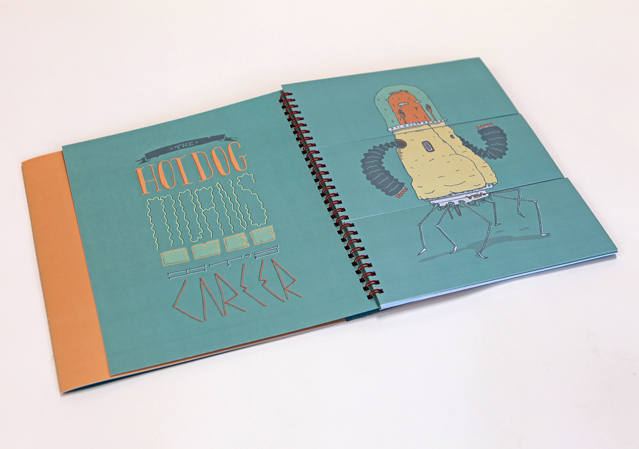 Jeff Lowry is an illustrator and a graduate of the University of Arizona's Visual Communications program. He created this clever "exquisite corpse" book in 2012. It was printed in an edition of 150 on archival paper using HP Indigo. It was printed by HP Indigo on archival paper at Spectrum Color in Tucson Arizona. There is a slip cover for the book made from book-binding chip board which has one of the page images adhered to it. Jeff will be moving to New York City in 2014 to go to graduate school.