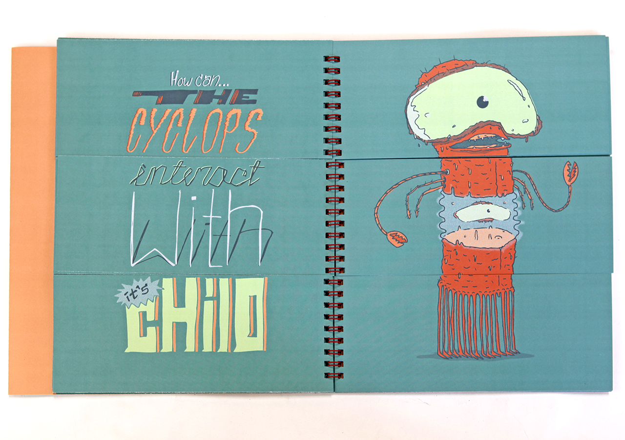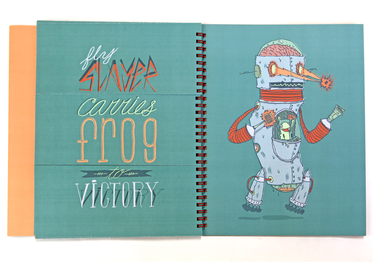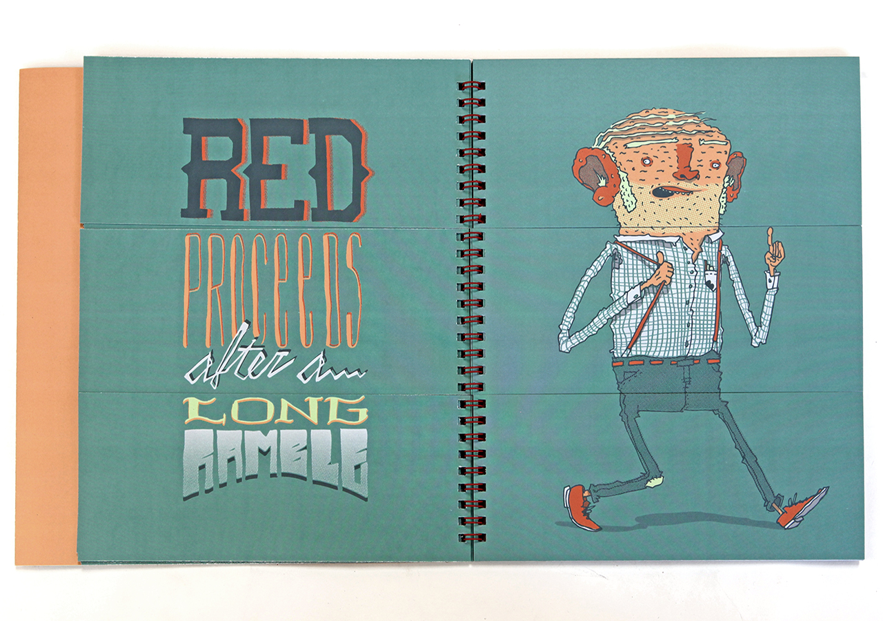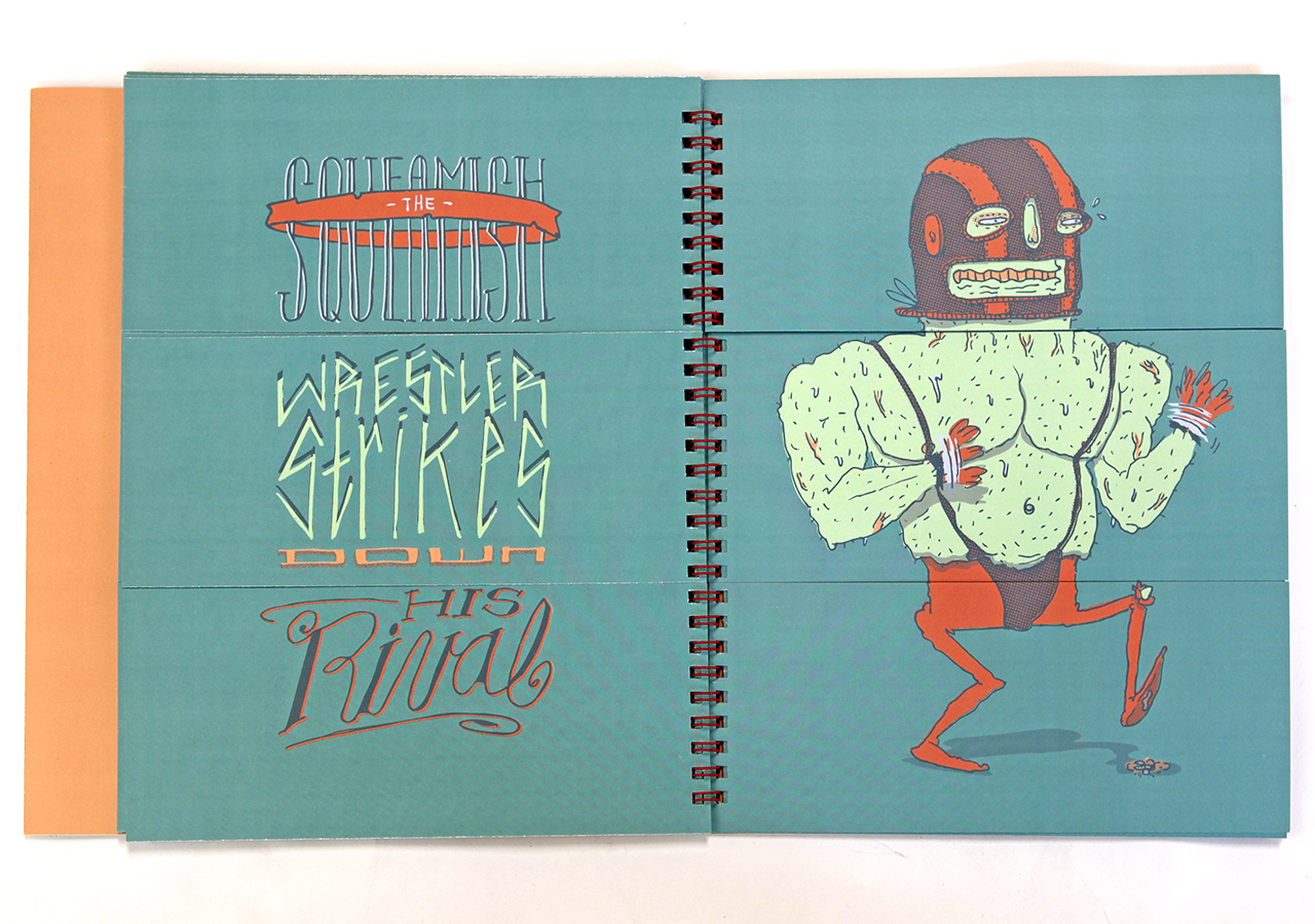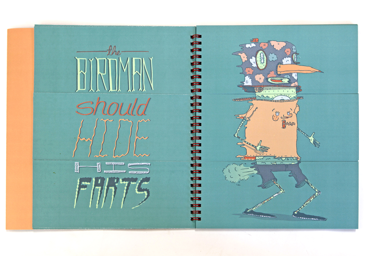 Here is Jeff's statement about his book: "Bodies N’ Type is a flap book that is loosely based around the Victorian parlour game The Exquisite Corpse and originated as a project for an assignment in my Visual Narrative and the Artists Book class at The University of Arizona. The original consisted of only 9 characters, but when given the chance to publish it I expanded it to 16 characters and 16 hand lettered phrases. The characters are on the right page and the related phrases are on the left. With a few flips of some flaps you can combine different parts to make new silly characters and phrases. This book was too much fun to work on, I found it hard at times to work on the illustrations because I would be laughing so much."