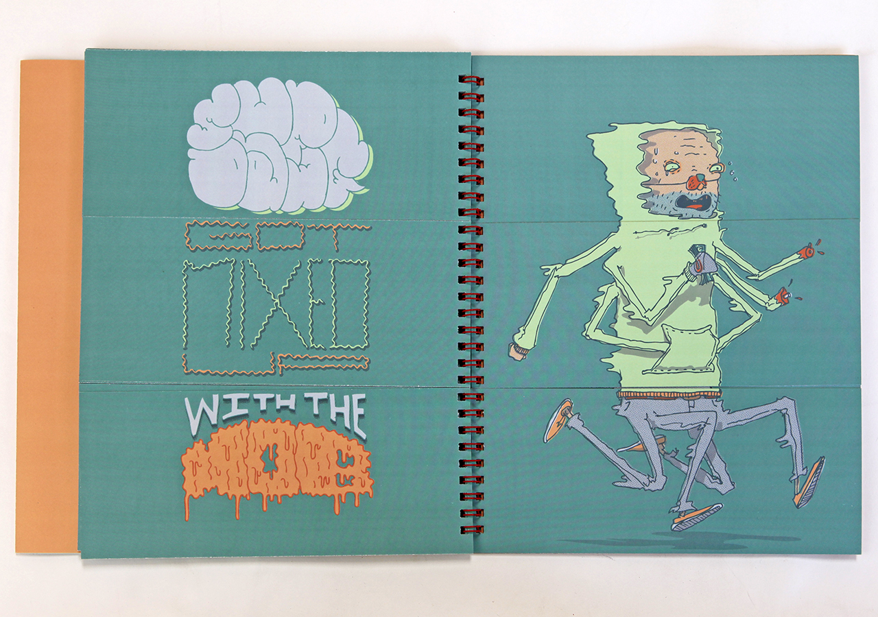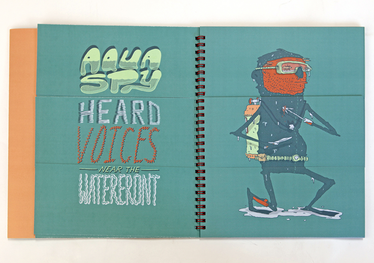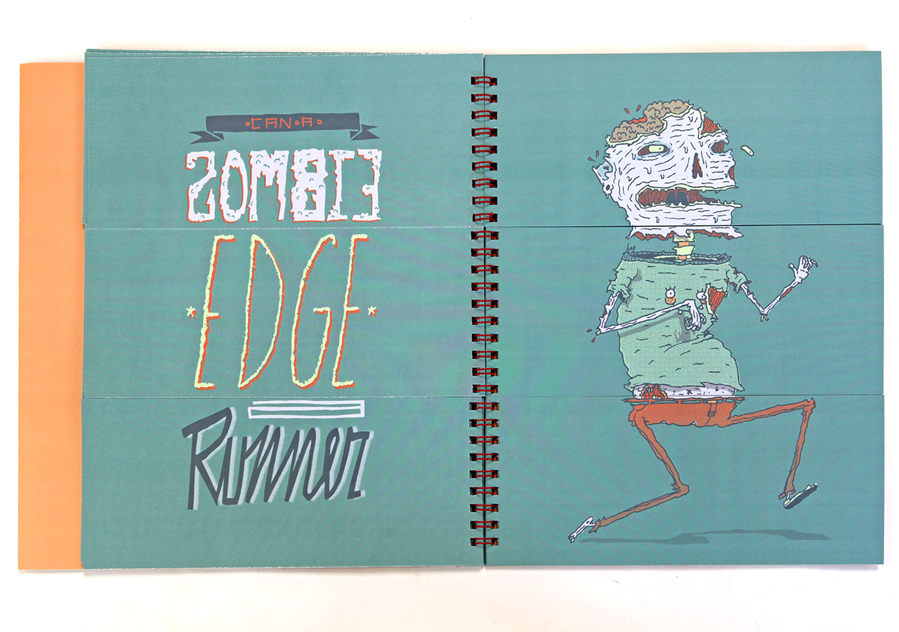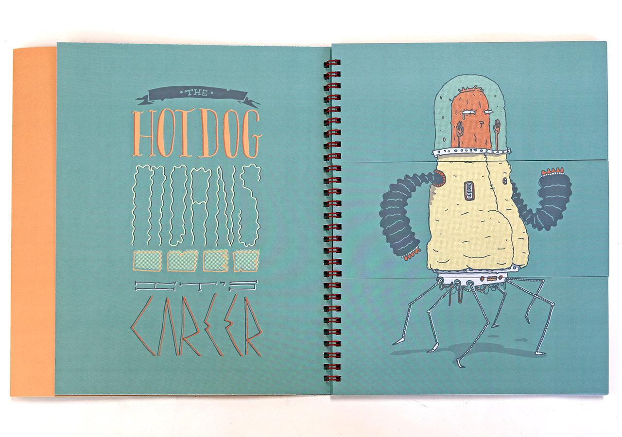 Here is Jeff's statement about his book: "Bodies N’ Type is a flap book that is loosely based around the Victorian parlour game The Exquisite Corpse and originated as a project for an assignment in my Visual Narrative and the Artists Book class at The University of Arizona. The original consisted of only 9 characters, but when given the chance to publish it I expanded it to 16 characters and 16 hand lettered phrases. The characters are on the right page and the related phrases are on the left. With a few flips of some flaps you can combine different parts to make new silly characters and phrases. This book was too much fun to work on, I found it hard at times to work on the illustrations because I would be laughing so much."