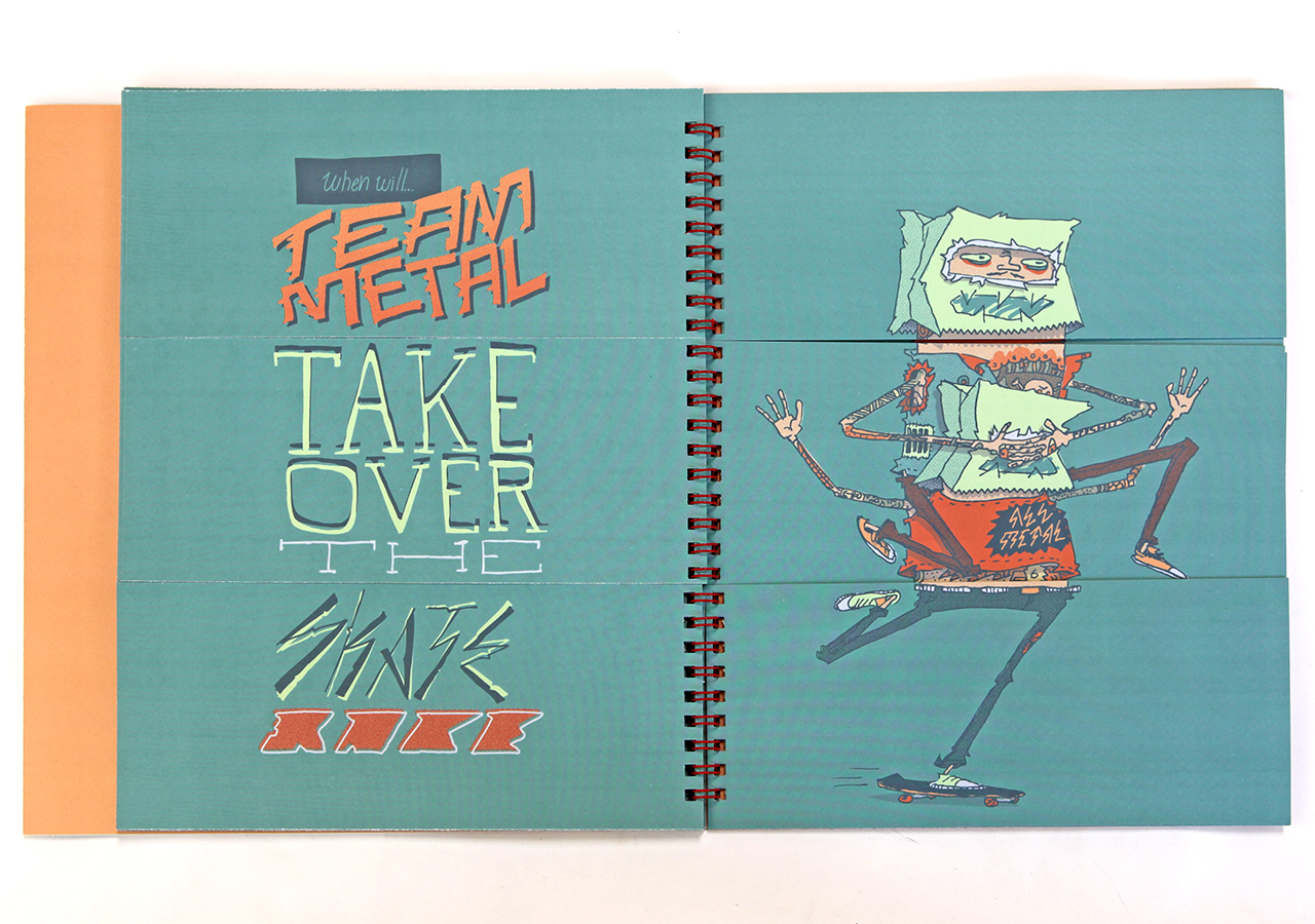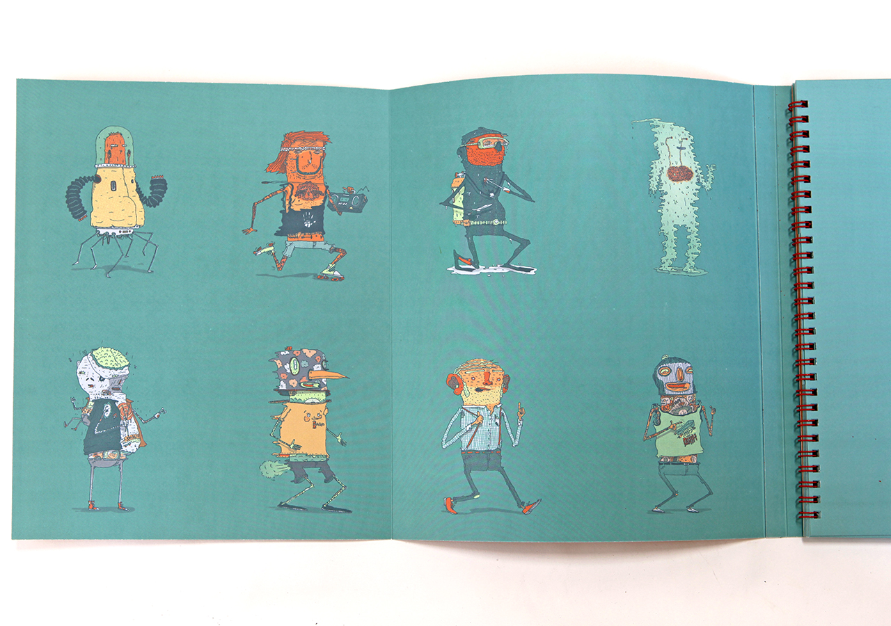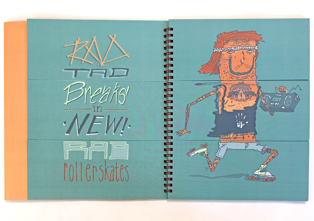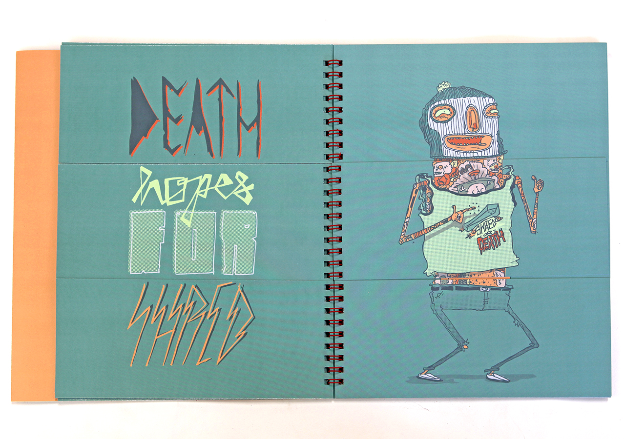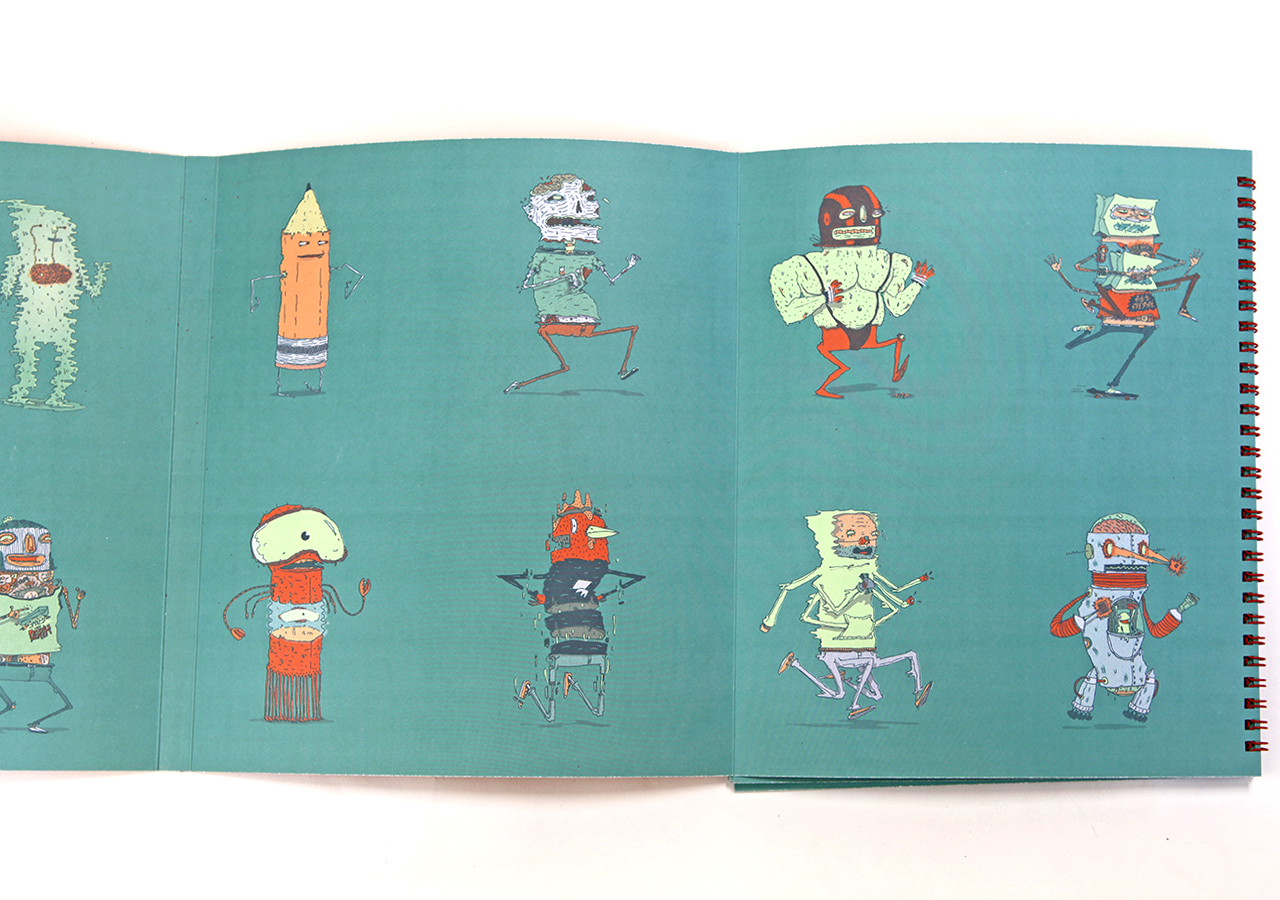 Here is Jeff's statement about his book: "Bodies N’ Type is a flap book that is loosely based around the Victorian parlour game The Exquisite Corpse and originated as a project for an assignment in my Visual Narrative and the Artists Book class at The University of Arizona. The original consisted of only 9 characters, but when given the chance to publish it I expanded it to 16 characters and 16 hand lettered phrases. The characters are on the right page and the related phrases are on the left. With a few flips of some flaps you can combine different parts to make new silly characters and phrases. This book was too much fun to work on, I found it hard at times to work on the illustrations because I would be laughing so much."