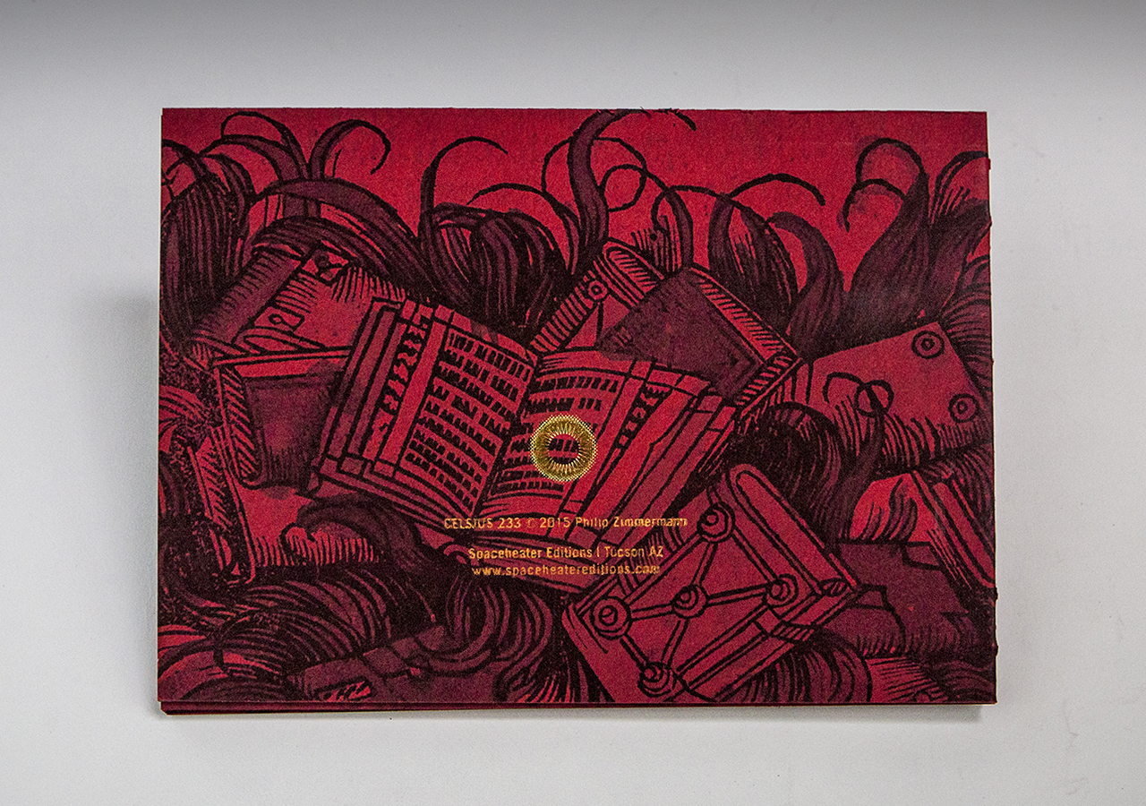Celsius 233 has 40 pages, is handbound using a multi-needle coptic stitch with sewn-on hard covers made of acid-free solid-core black museum board. The paper is acid-free French Paper. The images are printed using archival inkjet ink with three-color foil stamping on the cover, the title page and the back cover. The interior flame sheets are loose-inserted in a slot in each interior folio. It is printed in a signed and numbered edition of fifty and comes in an acid-free phase box. Dimensions are 6.5" x 9" x .375" (16.5cm x 23cm x 1cm). The price of the limited edition handbound book is $375 and includes a blu-ray DVD (see below).