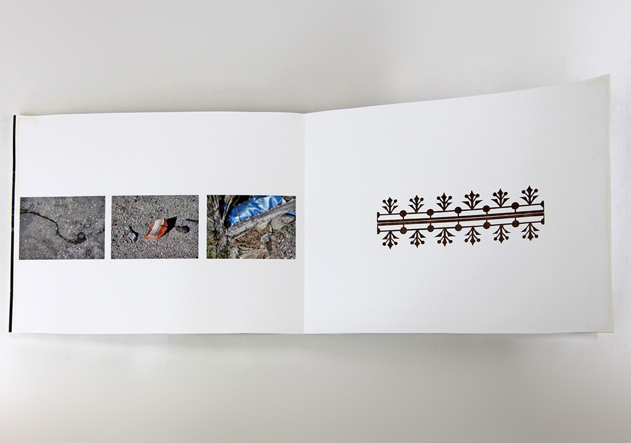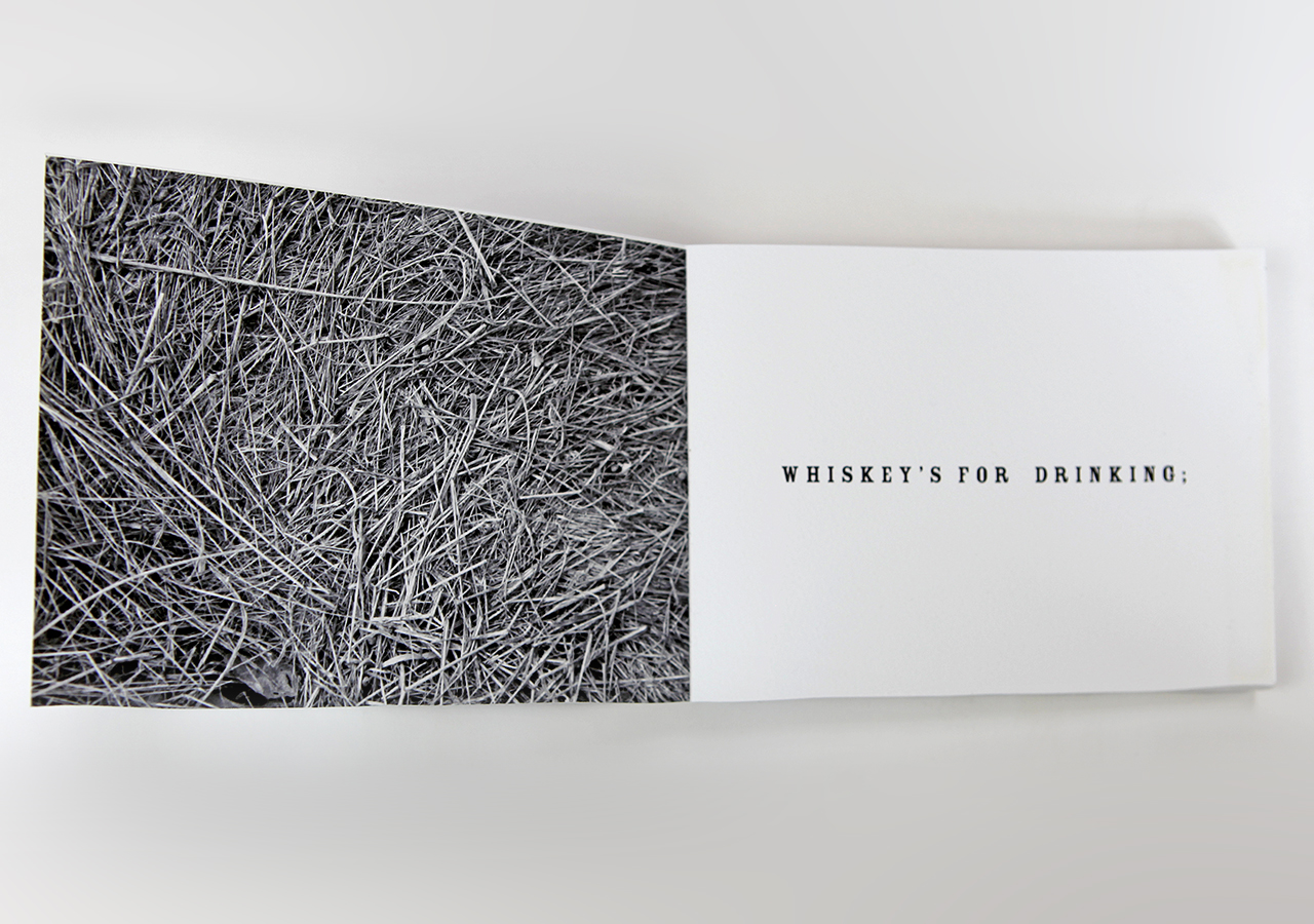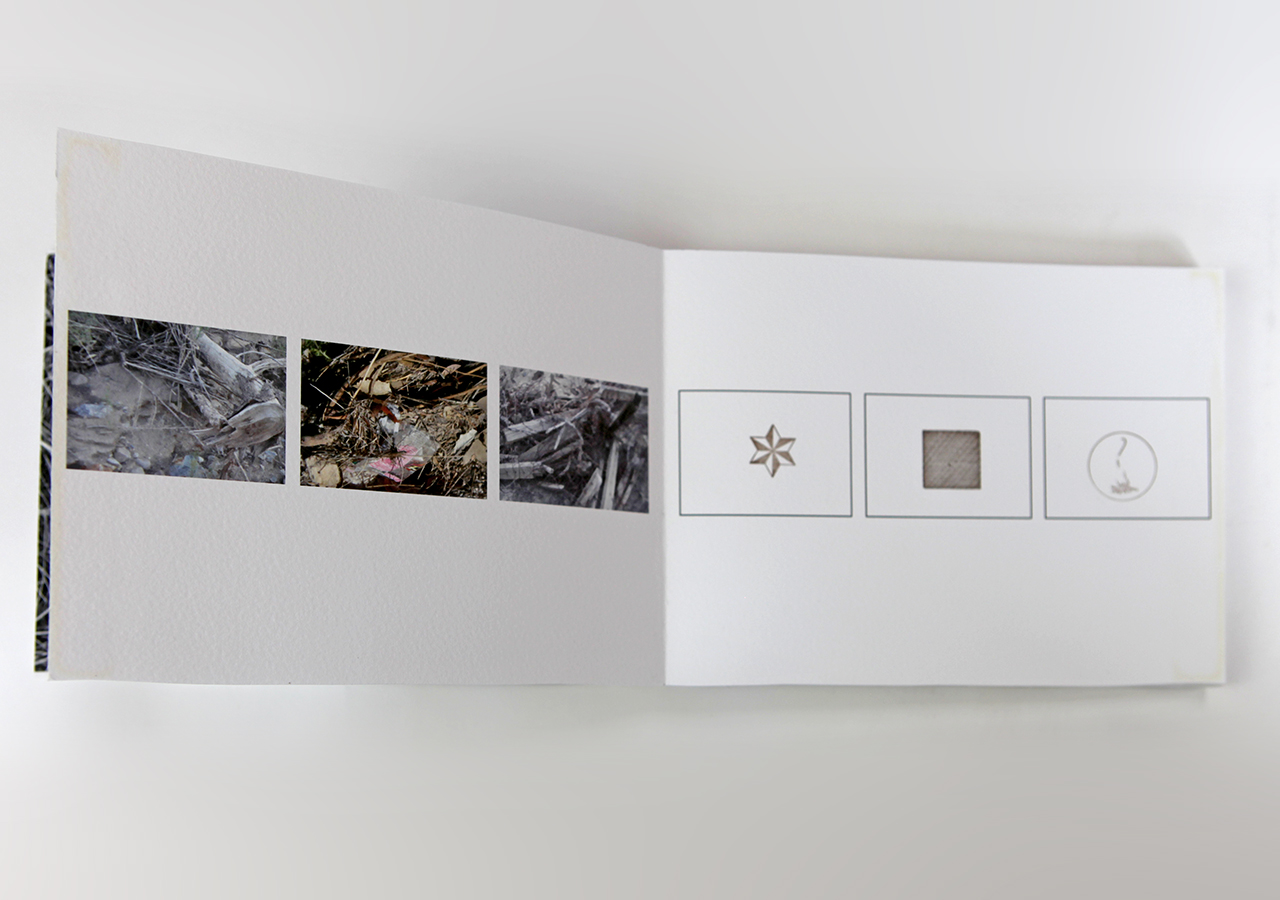 Karen made this book in a small edition of seven, printed in archival inkjet and letterpress. She writes: "Who owns water? Most states in the USA claim that the people have the right to water. I can't imagine anything other than everyone having a right to free water, but its not the case. The right to water was an idea that I was thinking about when developing in this book.  “First user in time, first right” but where is the democracy? The diversions and claiming of water has had a profound change in the landscape. The access to water, I believe, has defined the landscape and the society. This book is about my experience living on the margin of the city, defined by a river. The river is dry during much of the year and violently flowing in others when the snow melts from the nearby mountains. Hundreds of years ago, before the dams, the river ran all year long. There are three themes that flow in the book, the margins of society (homeless who live in the river), the history of the damming of the rivers that feed into mine and subsequent natural changes, and margins of two countries, Mexico and USA, where the river flows from one to the other. The book documents my walks through the riverbed. The book is primarily photographic with some text and letterpress images. There are two phrases in the book about water rights. Additionally, there are some graphic images that eludes to the flow of water and people."