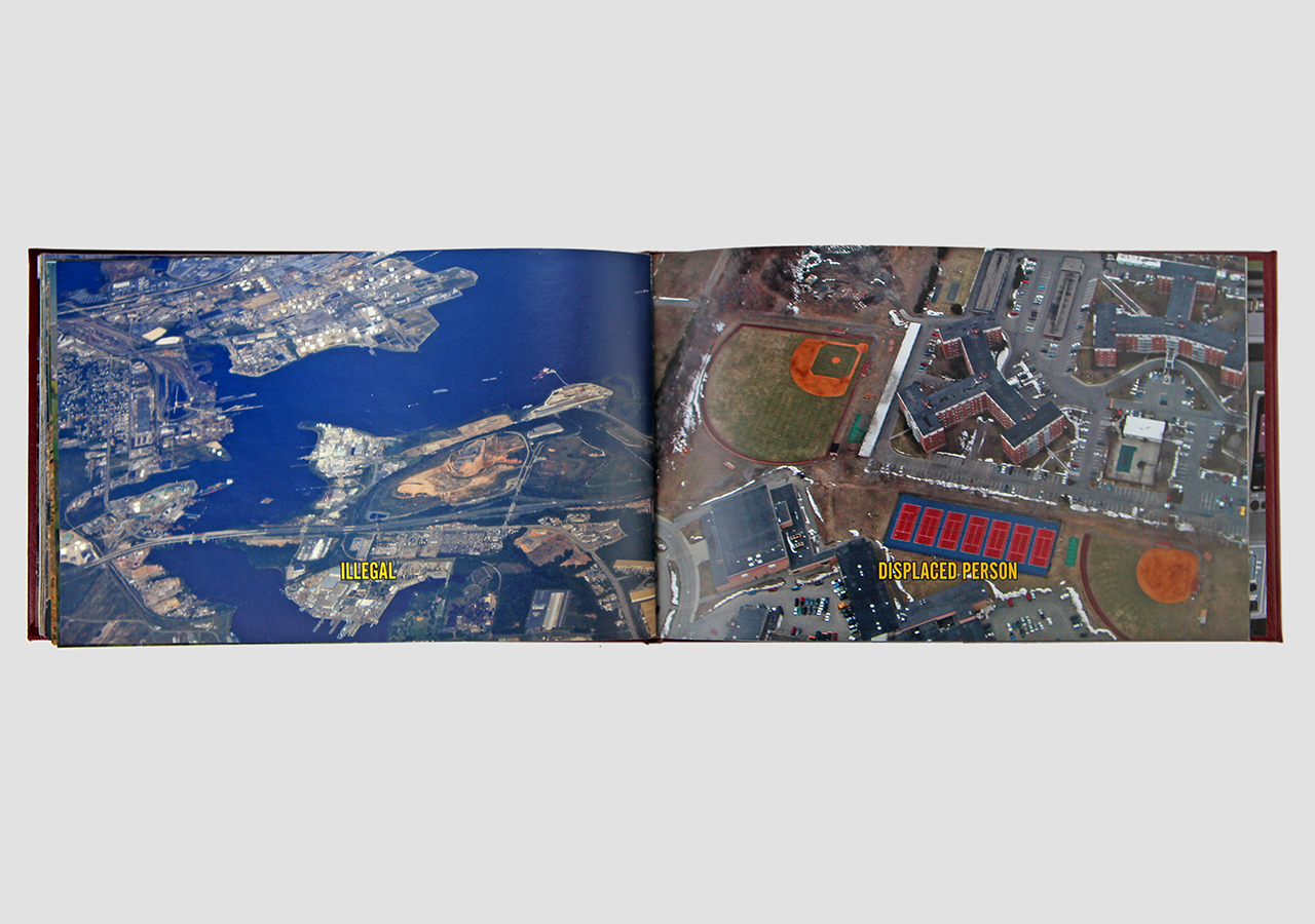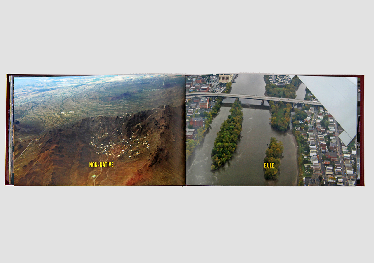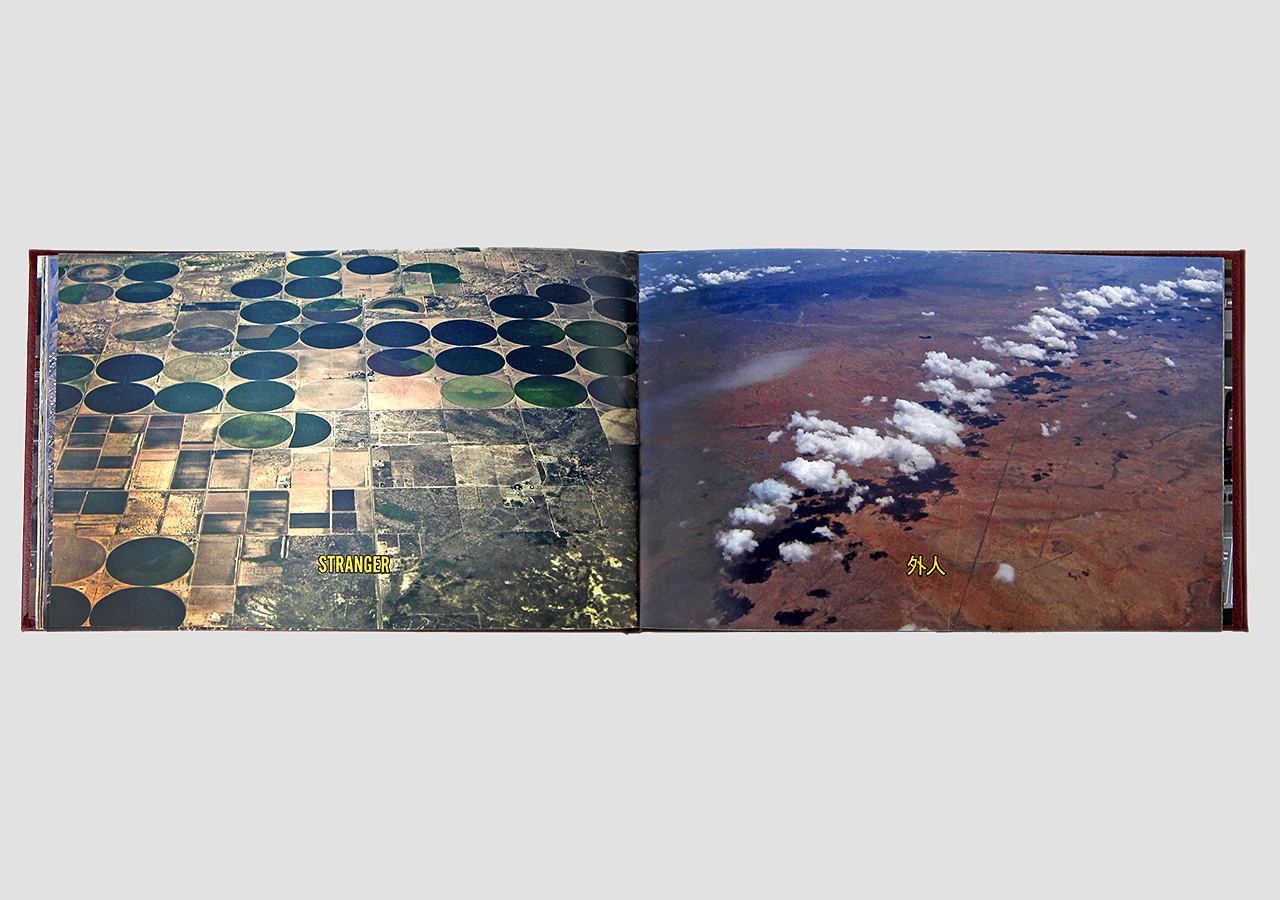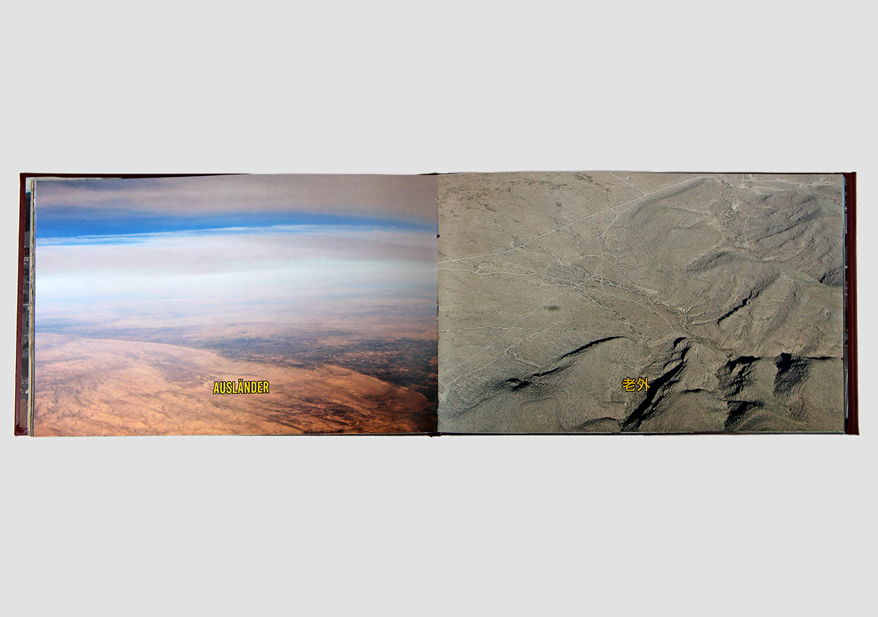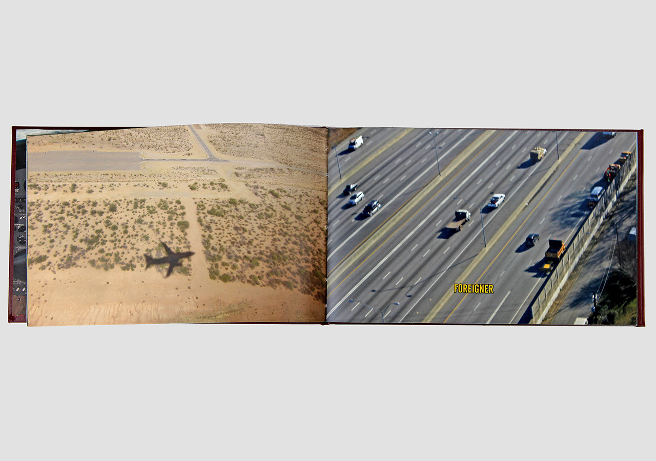 However "Below" (the other, mirror, section) is about the flip-side of wanderlust. In this book the traveler, displaced person, or foreigner encounters a virulent and often jingoistic resistance from the inhabitants of the new locations that one enters as a visitor. Terms for ‘the other’, usually derogatory or demeaning, appear over photographic views looking down from airplane windows. Although I believe this to be universal, living in Southern Arizona on the border with Mexico I am very aware of this viewpoint in some of the local state population. In addition to the feelings that I have about this subject derived from my current living location, I was the child of an American diplomat. Although I grew up loving the many different places we lived, I never fit in to any of them, nor felt that any one of the places we lived was my home, always feeling like ‘the other’, and that includes the United States itself.