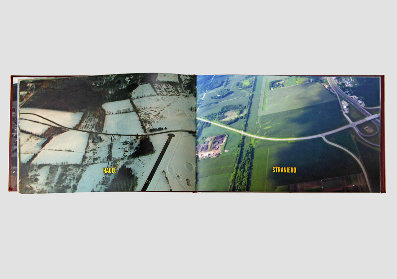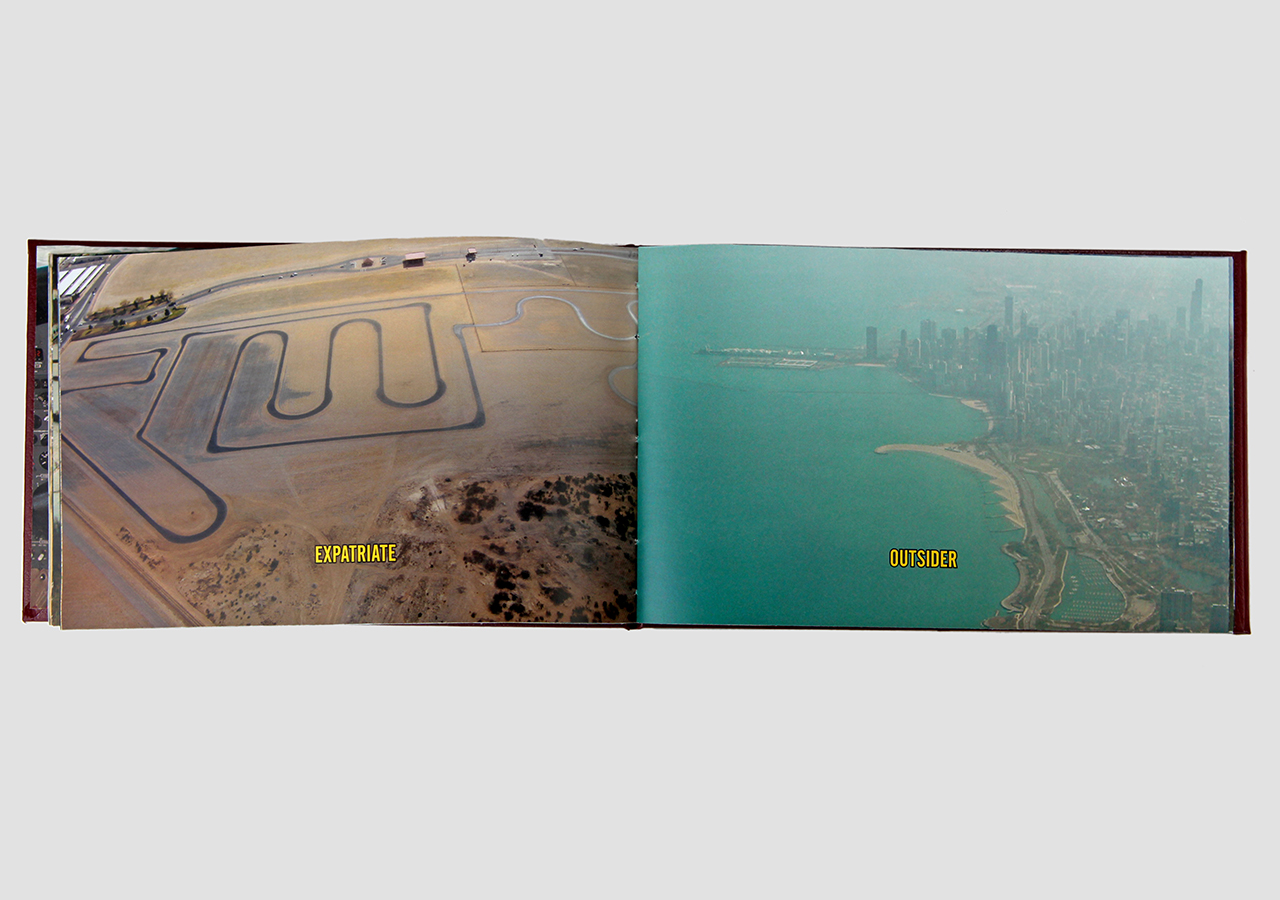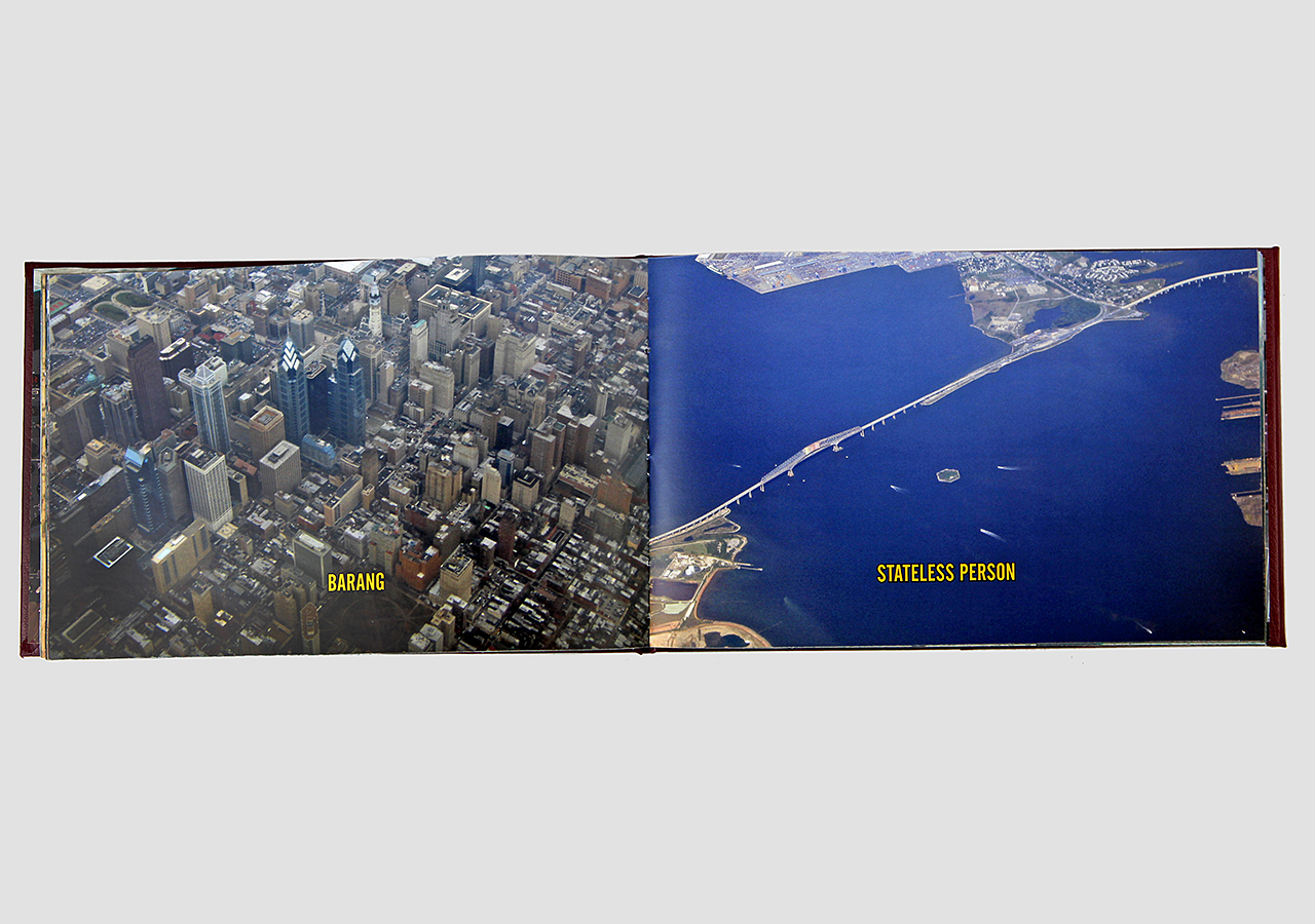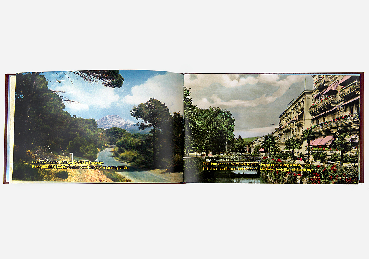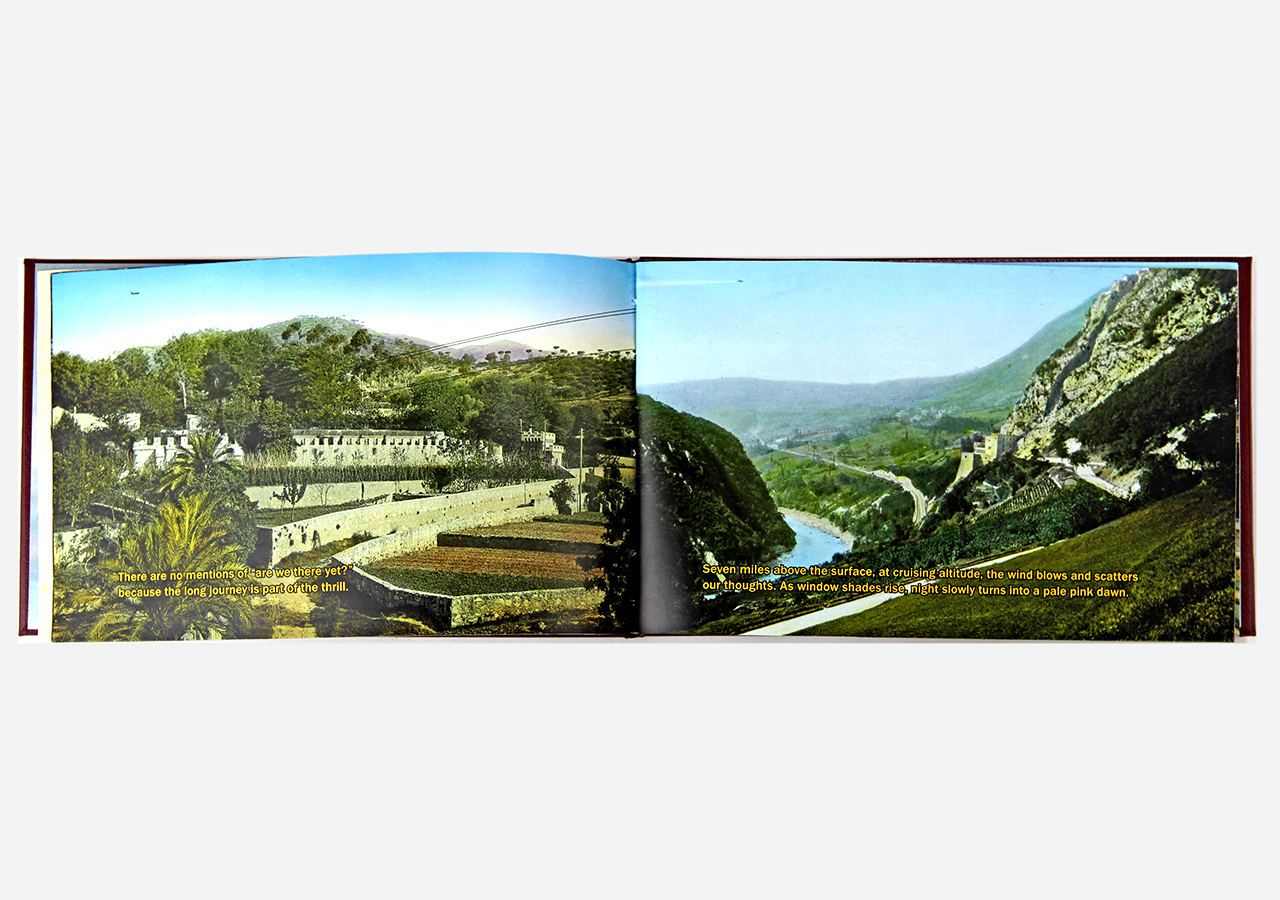 However "Below" (the other, mirror, section) is about the flip-side of wanderlust. In this book the traveler, displaced person, or foreigner encounters a virulent and often jingoistic resistance from the inhabitants of the new locations that one enters as a visitor. Terms for ‘the other’, usually derogatory or demeaning, appear over photographic views looking down from airplane windows. Although I believe this to be universal, living in Southern Arizona on the border with Mexico I am very aware of this viewpoint in some of the local state population. In addition to the feelings that I have about this subject derived from my current living location, I was the child of an American diplomat. Although I grew up loving the many different places we lived, I never fit in to any of them, nor felt that any one of the places we lived was my home, always feeling like ‘the other’, and that includes the United States itself.