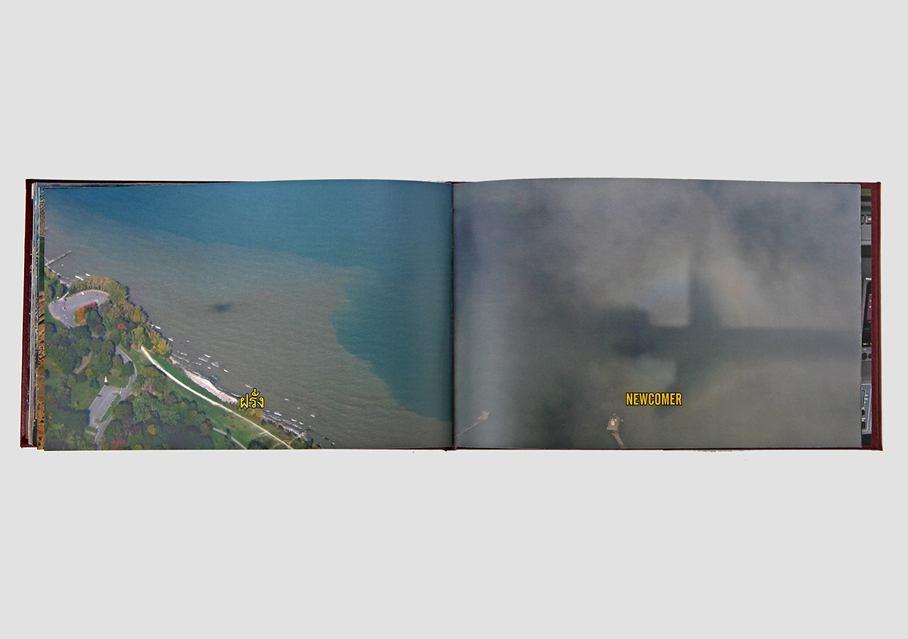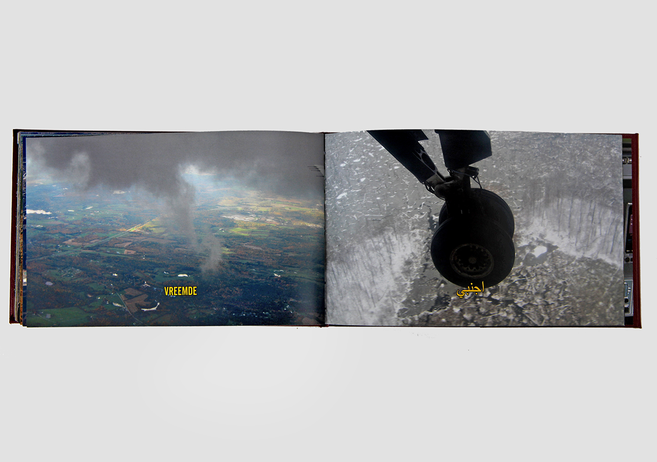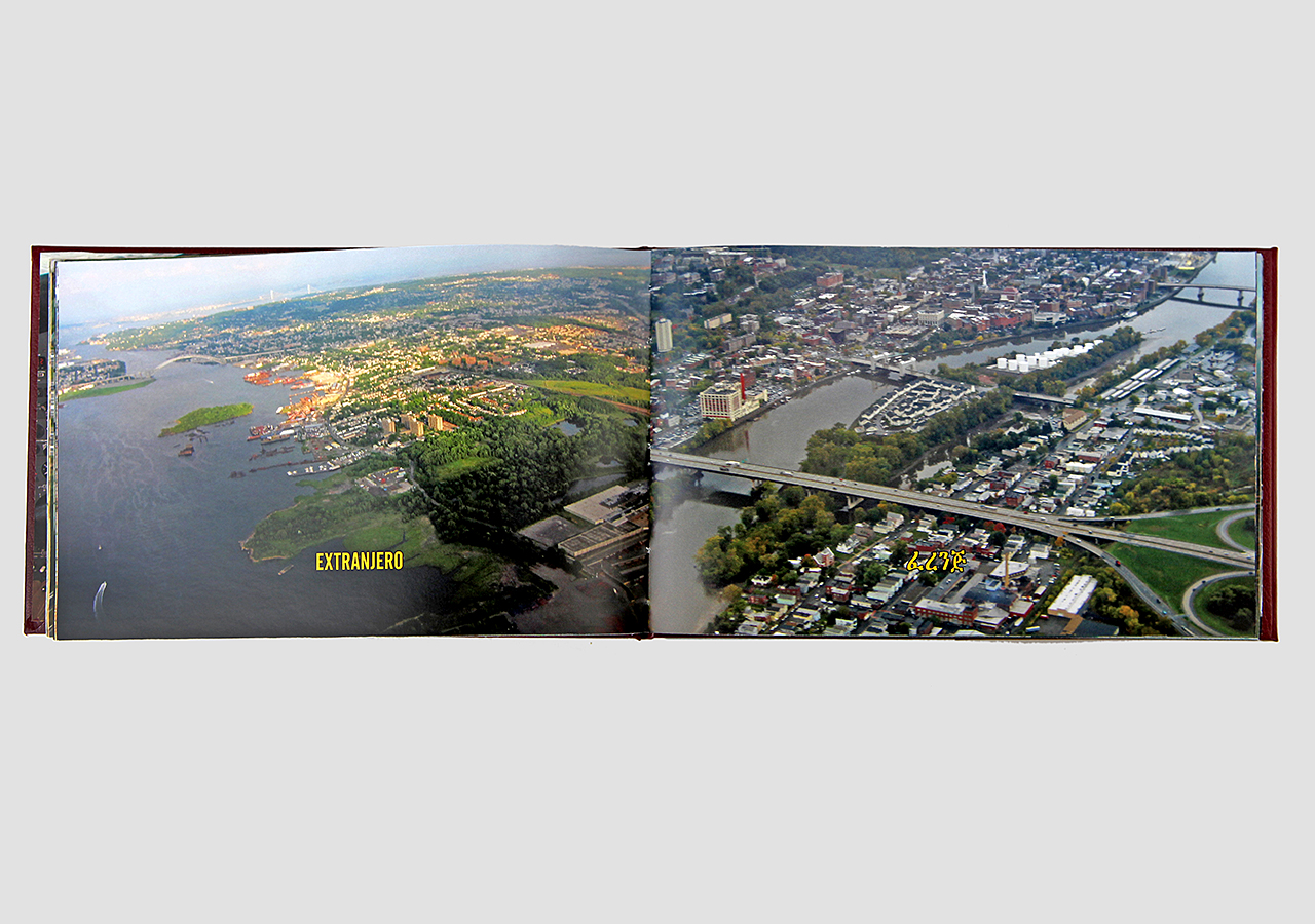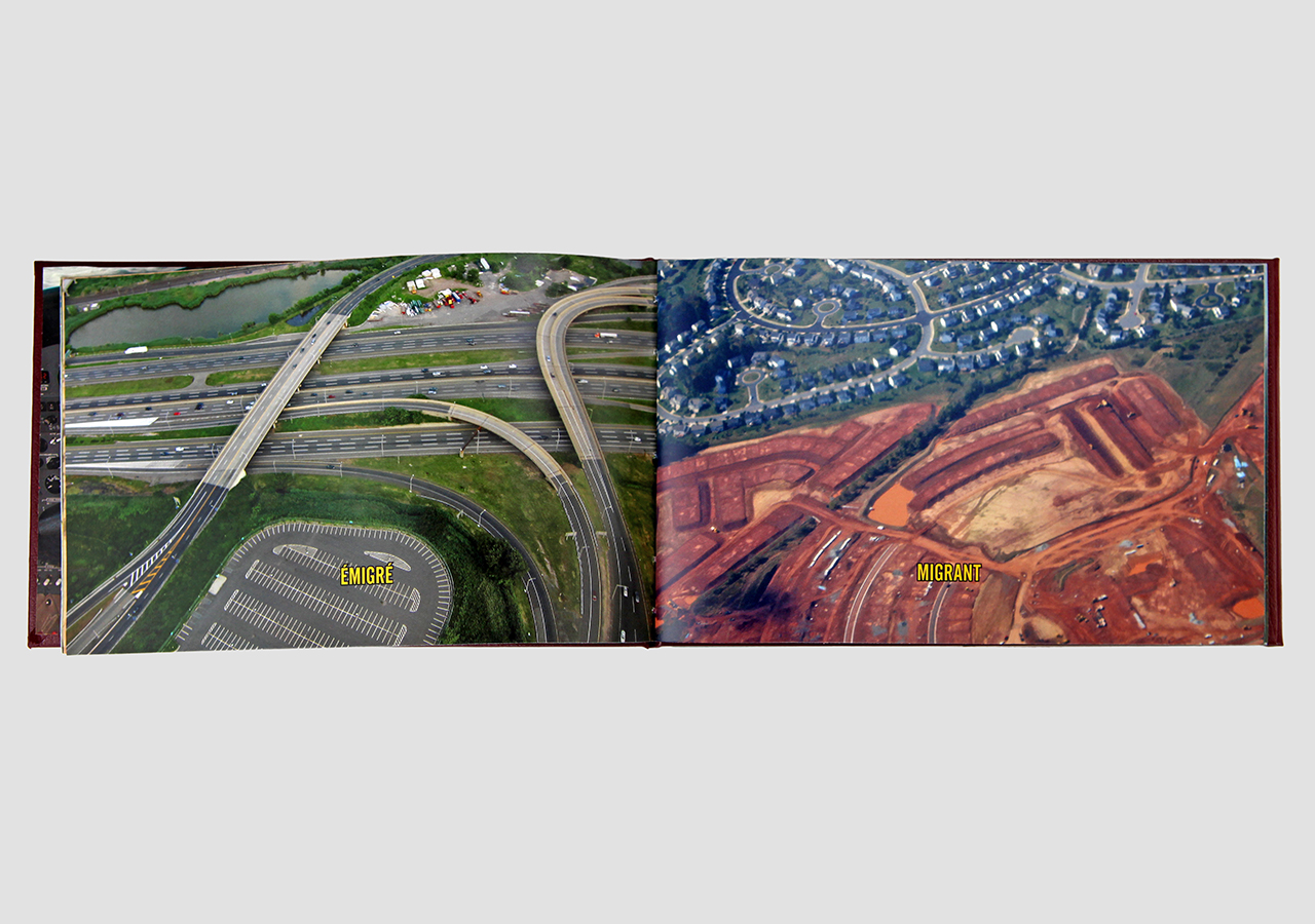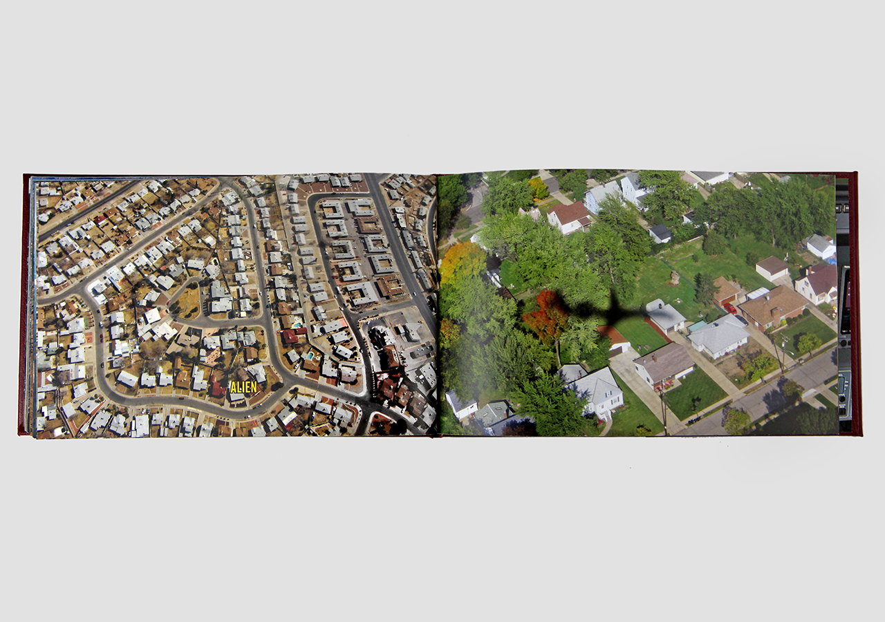 However "Below" (the other, mirror, section) is about the flip-side of wanderlust. In this book the traveler, displaced person, or foreigner encounters a virulent and often jingoistic resistance from the inhabitants of the new locations that one enters as a visitor. Terms for ‘the other’, usually derogatory or demeaning, appear over photographic views looking down from airplane windows. Although I believe this to be universal, living in Southern Arizona on the border with Mexico I am very aware of this viewpoint in some of the local state population. In addition to the feelings that I have about this subject derived from my current living location, I was the child of an American diplomat. Although I grew up loving the many different places we lived, I never fit in to any of them, nor felt that any one of the places we lived was my home, always feeling like ‘the other’, and that includes the United States itself.