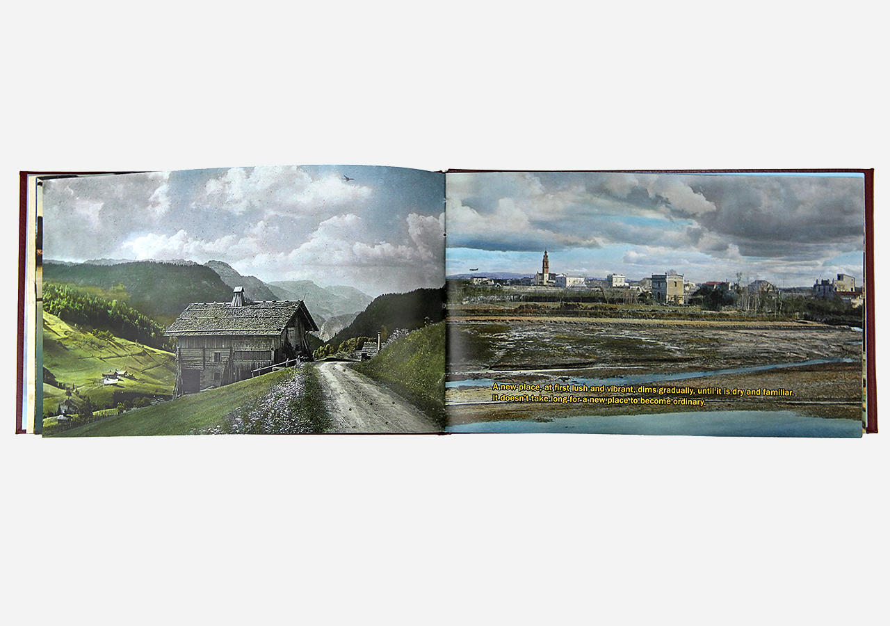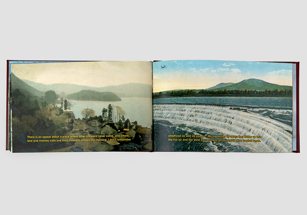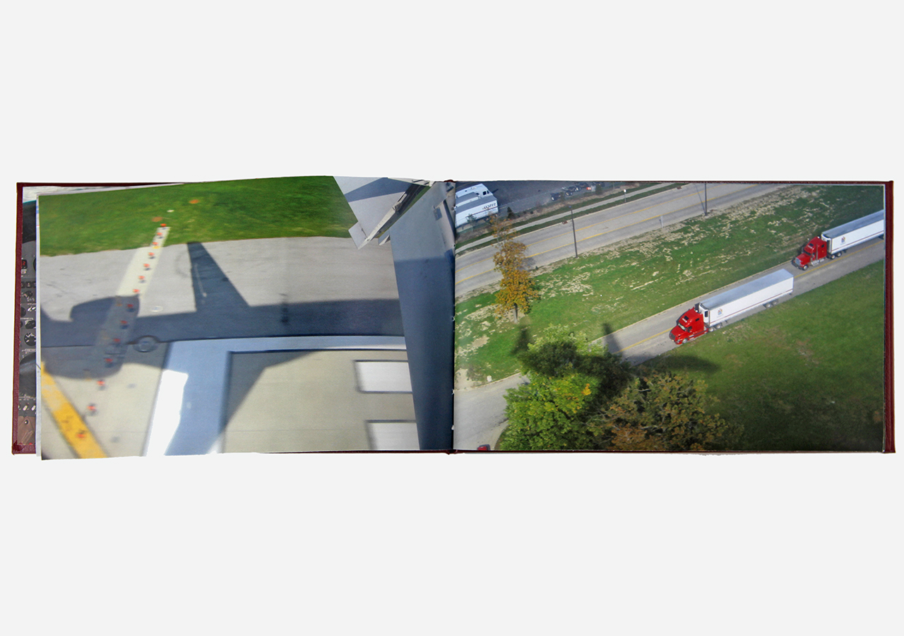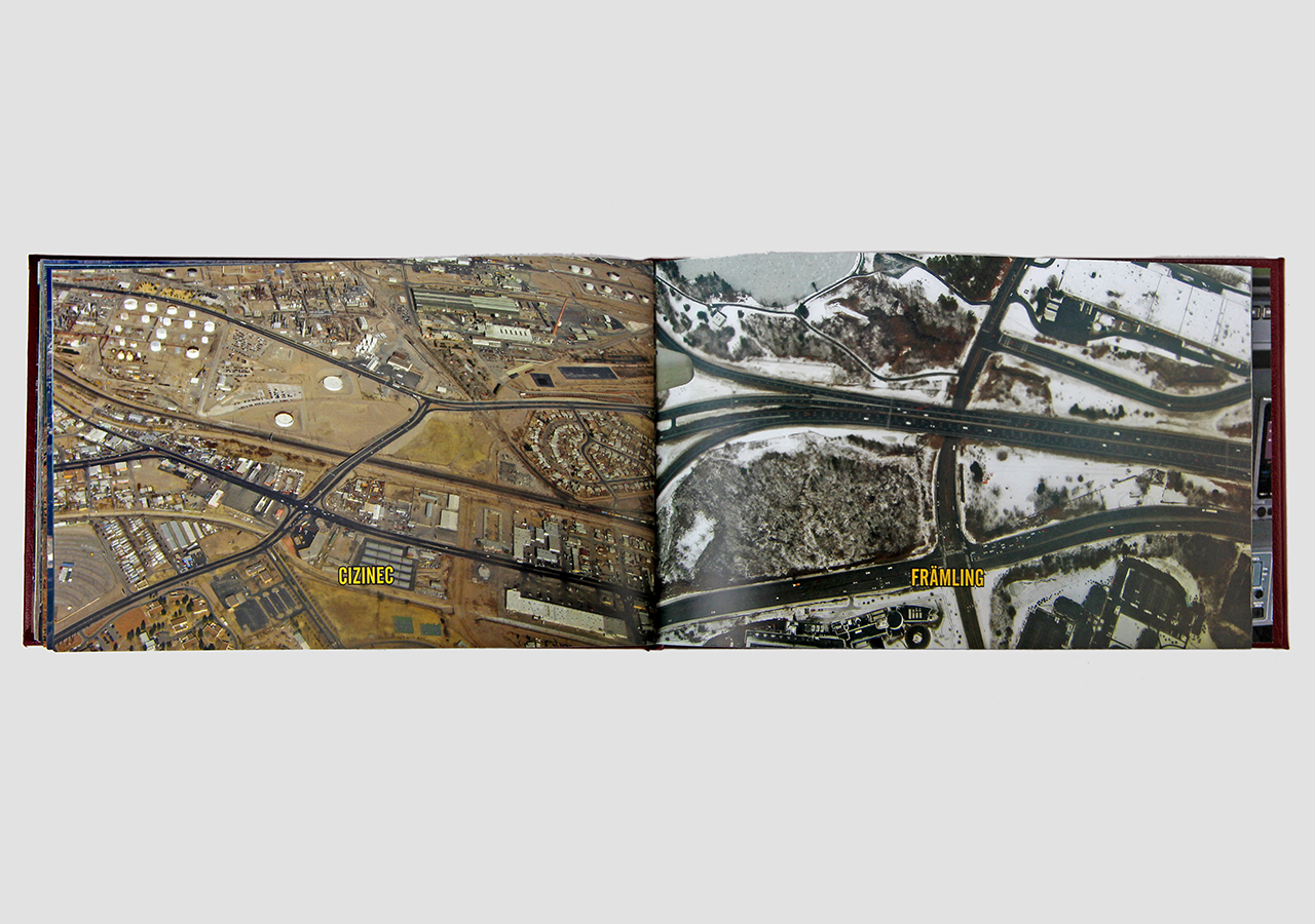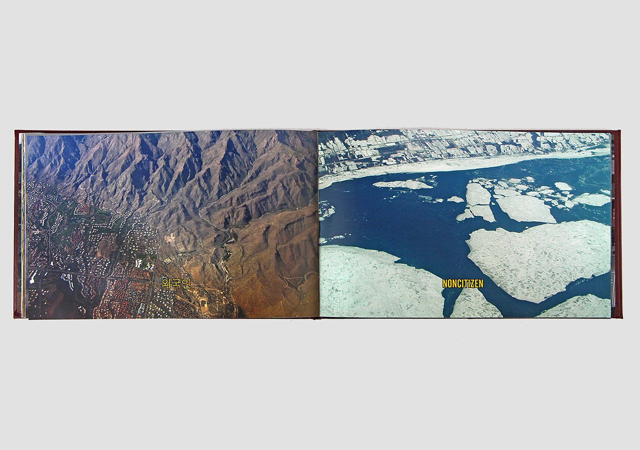 However "Below" (the other, mirror, section) is about the flip-side of wanderlust. In this book the traveler, displaced person, or foreigner encounters a virulent and often jingoistic resistance from the inhabitants of the new locations that one enters as a visitor. Terms for ‘the other’, usually derogatory or demeaning, appear over photographic views looking down from airplane windows. Although I believe this to be universal, living in Southern Arizona on the border with Mexico I am very aware of this viewpoint in some of the local state population. In addition to the feelings that I have about this subject derived from my current living location, I was the child of an American diplomat. Although I grew up loving the many different places we lived, I never fit in to any of them, nor felt that any one of the places we lived was my home, always feeling like ‘the other’, and that includes the United States itself.
