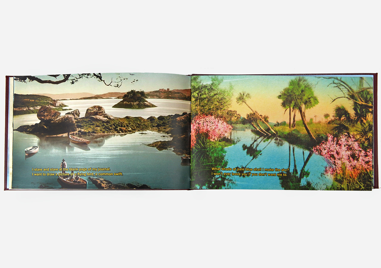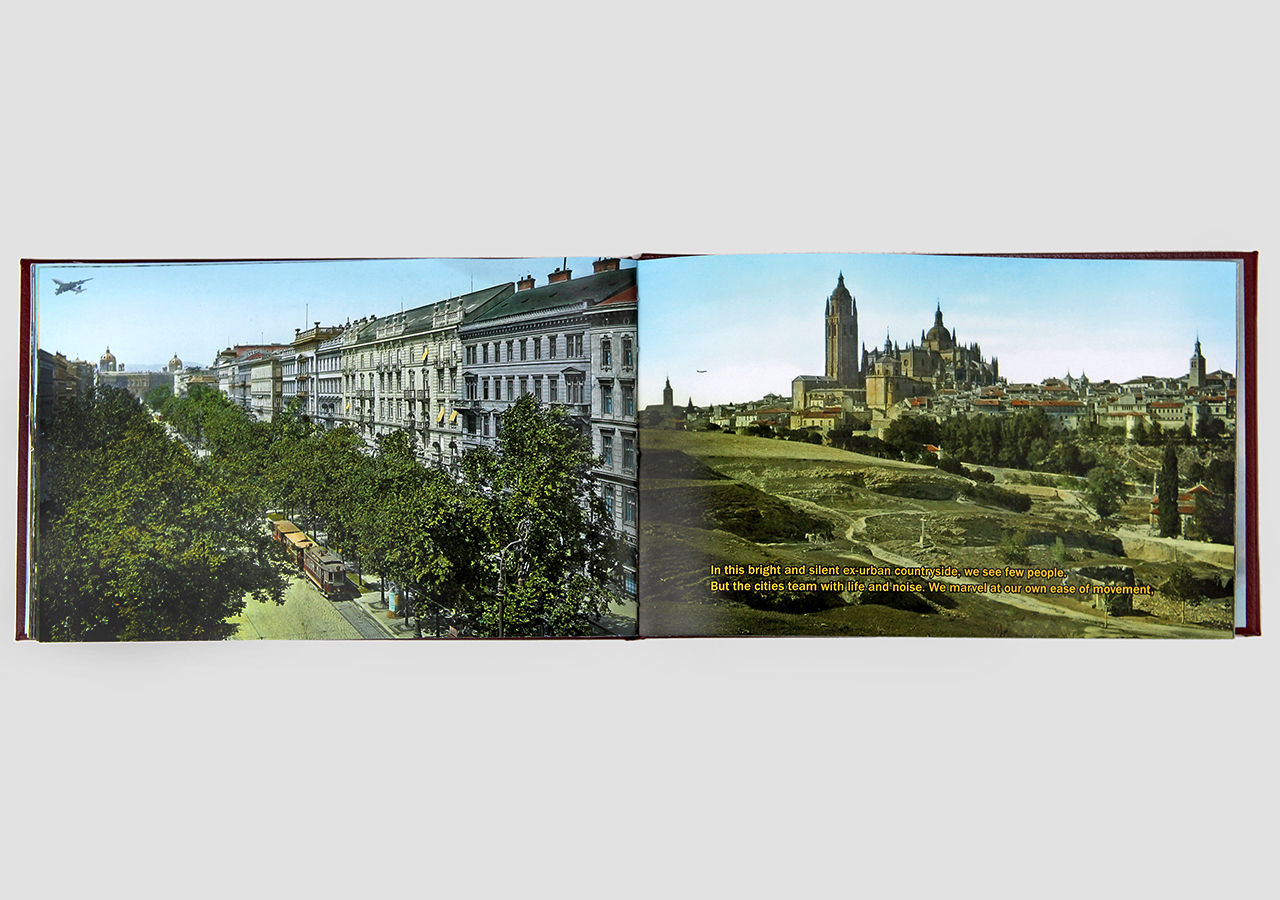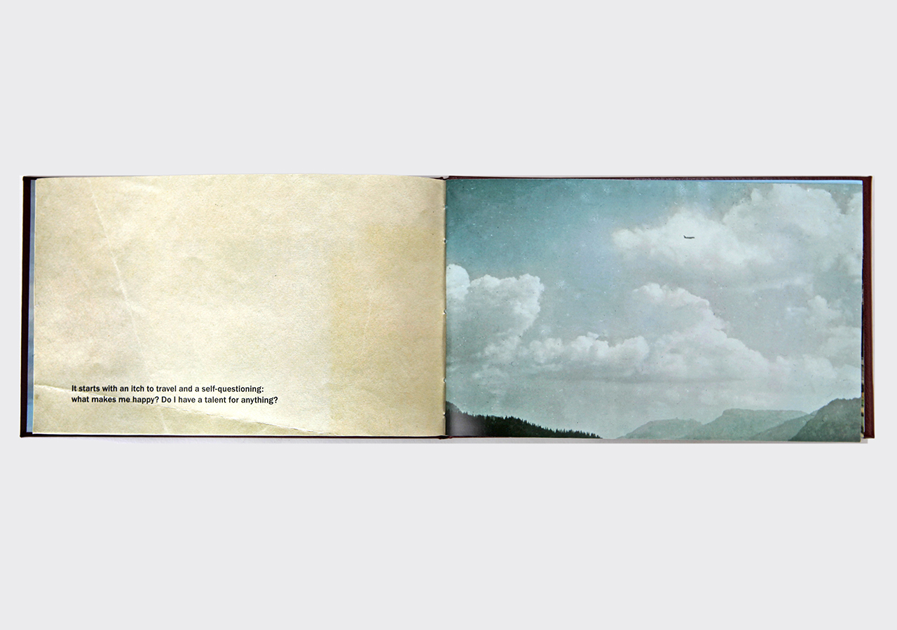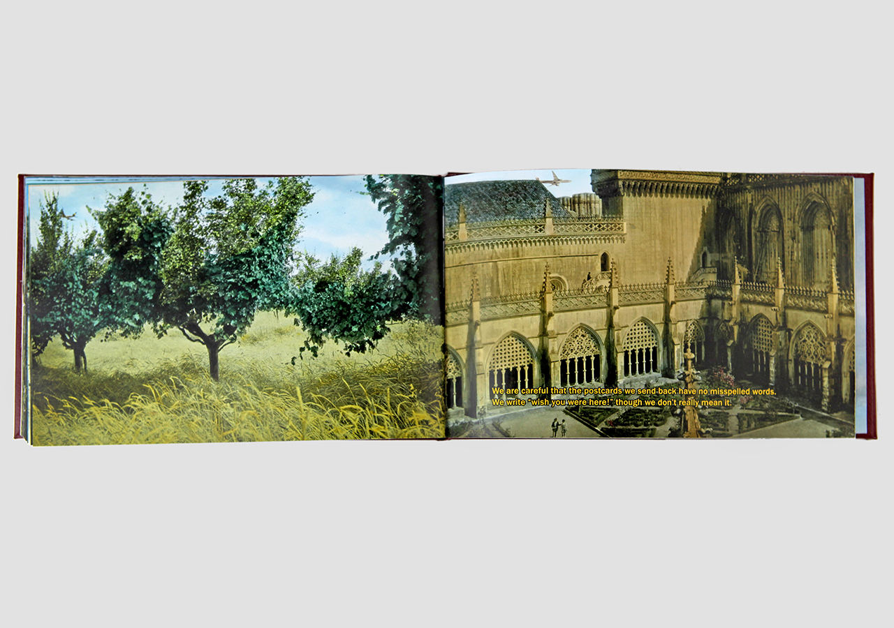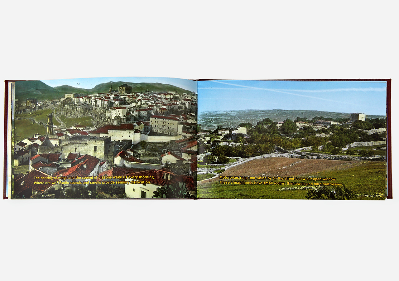 However "Below" (the other, mirror, section) is about the flip-side of wanderlust. In this book the traveler, displaced person, or foreigner encounters a virulent and often jingoistic resistance from the inhabitants of the new locations that one enters as a visitor. Terms for ‘the other’, usually derogatory or demeaning, appear over photographic views looking down from airplane windows. Although I believe this to be universal, living in Southern Arizona on the border with Mexico I am very aware of this viewpoint in some of the local state population. In addition to the feelings that I have about this subject derived from my current living location, I was the child of an American diplomat. Although I grew up loving the many different places we lived, I never fit in to any of them, nor felt that any one of the places we lived was my home, always feeling like ‘the other’, and that includes the United States itself.