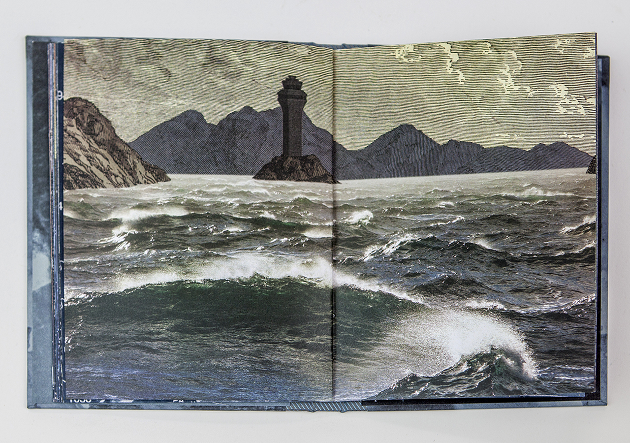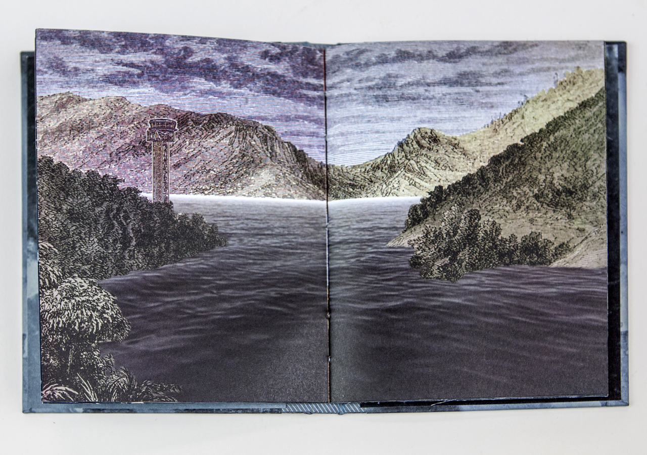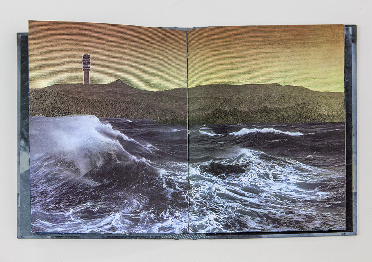 When I thought of a sea level rise of two hundred feet and what that could mean in terms of our cities and our society, the future seemed incredibly bleak. For the landscapes in the book, I decided to create a dystopian set of images that hinted at a future watery world, one where the remnants of civilizations lived in armed and guarded towers, growing their food in vertical farms inside these towers. The rest of the world population would have mostly died off. Marauding remnants exist in small groups that would try to gain entrance into these armed tower structures. The backgrounds of these images were built using scans of steel engravings from several 19th century books. I used photos of water and waves to make the foregrounds. I have long been interested in airport control towers and have many photos of them around the world. They seemed to me like the modern version of towers on medieval castles. Using a web app by the programmer Evan Wallace, called webgl-filter, I changed the airport control tower photos into dithered images that looked more like the background steel engravings. The assembly and coloration of the images was done in Photoshop. The goal was to create a series of images of a forbidding and lonely watery world, one that was austerely beautiful but scary and thought-provoking.