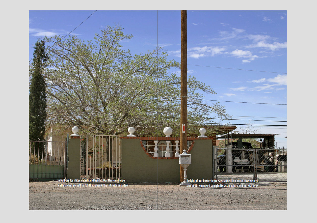 The irony is that although we as a country have spent such vast amounts of money on the fence sections that have been built, it really is not that effective. Thousands climb over weekly using ladders, tunnels, ropes, car ramps, and pure acrobatic climbing skills. It is clear that the wall is mostly an extremely expensive political and psychological construct rather than a truly effective deterrent to keeping drug smugglers and immigrants out of the United States. Are the walls and fences at Westway partially a status-symbol? Many inhabitants of Westway, with no building codes, certainly vie with their neighbors for glitzy details and height. Our Mexican border wall also has something of that: seeing the intimidating steel height of our border fence says something about how we feel about our supposed superiority as a country and our status as a desirable place where all of humanity wants to be, in effect making us a huge gated community.