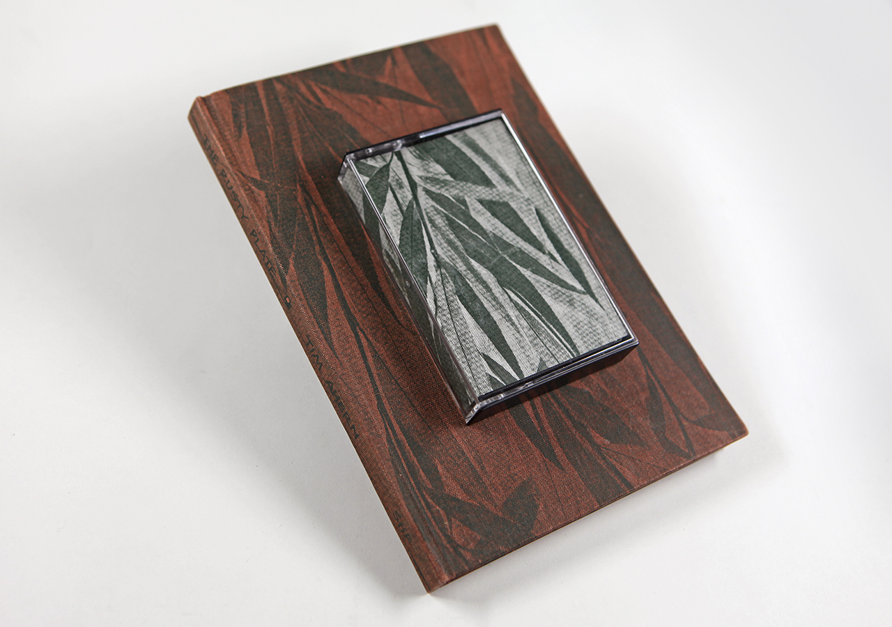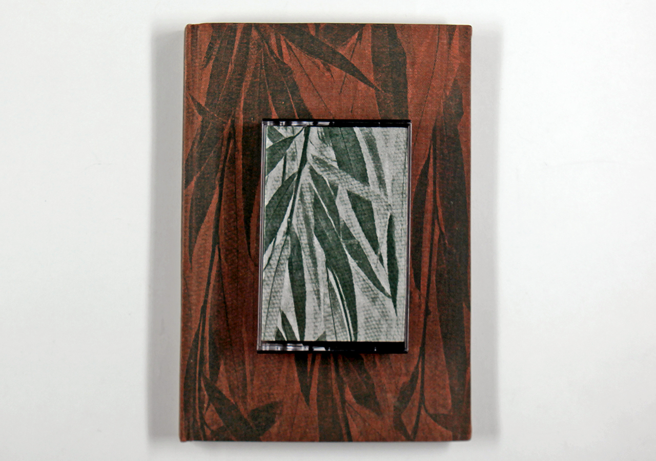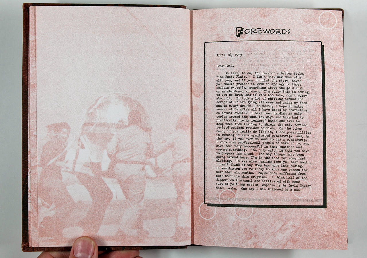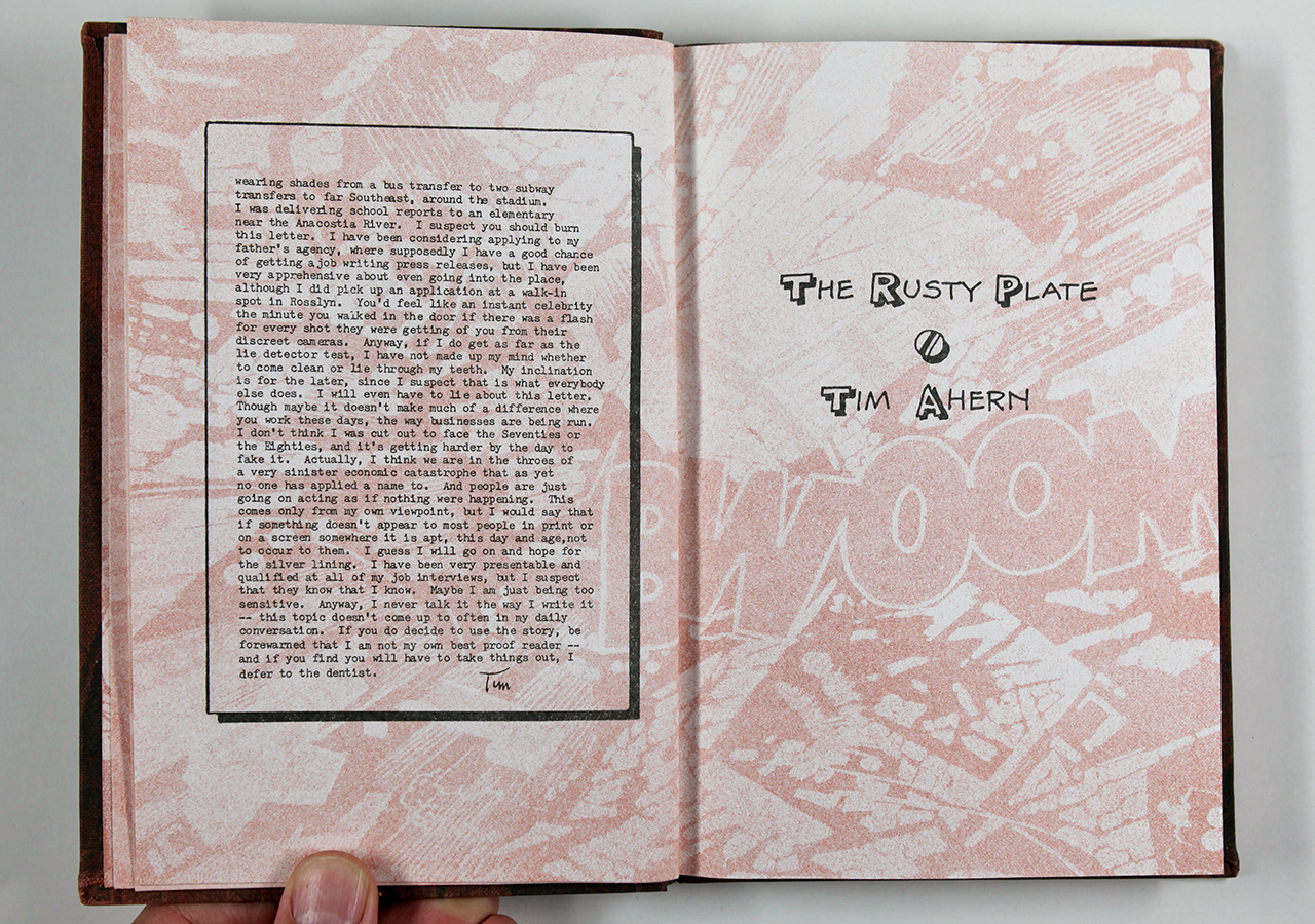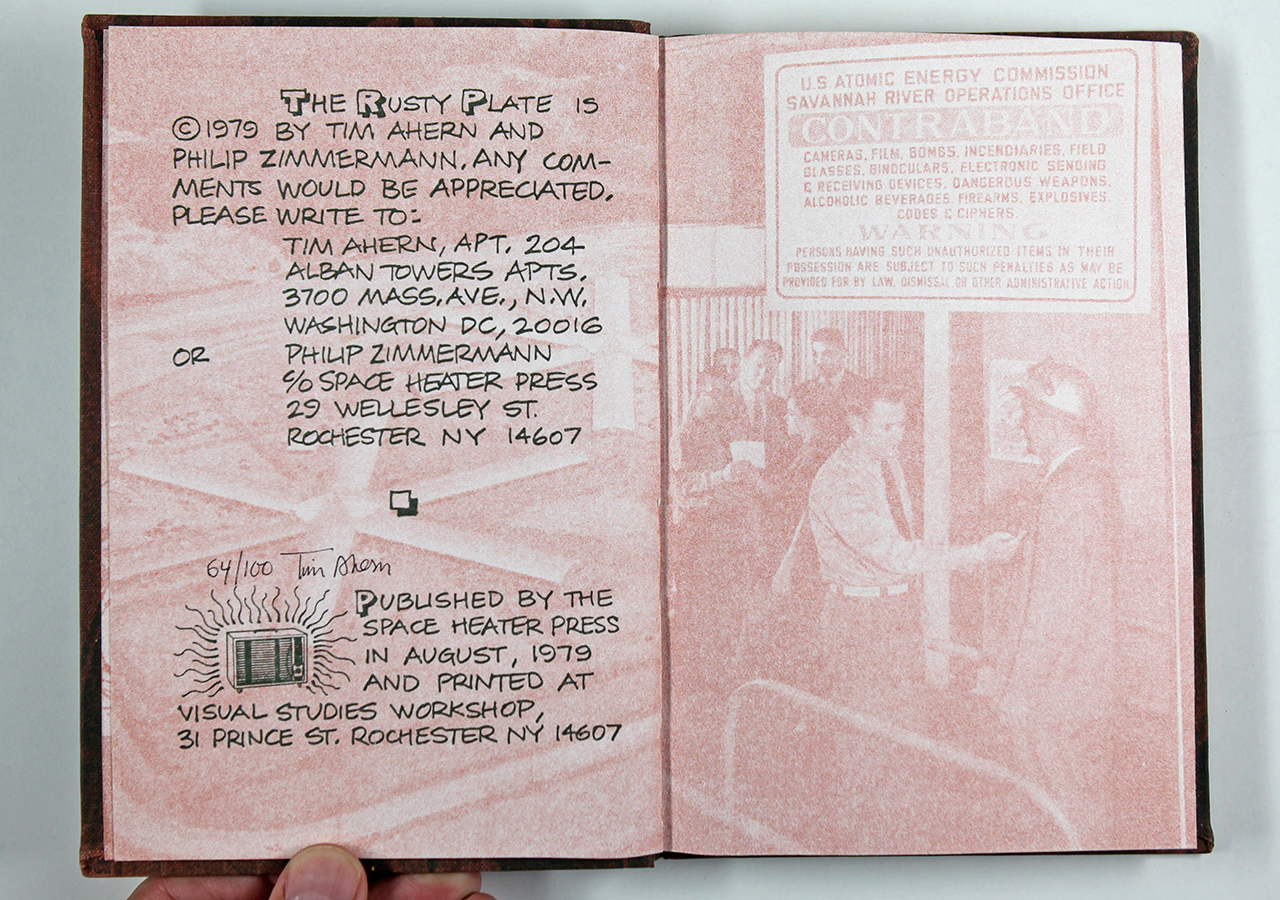 The Rusty Plate was a book written by Tim Ahern, an old friend of mine. Tim wrote the text, a dark yet strangely humorous story about nuclear meltdowns á la Three Mile Island (which had happened not long before). Taking a cue from the text, I designed the book so that it looked a little like a comic book (I hand-lettered the text throughout) and put images from U.S. Government nuclear testing from the fifties behind the text and as the end sheets. I silkscreened an image of willow leaves on the rust colored book cloth fabric. I recorded on a small Nakamichi reel-to-reel tape recorder (way before there was an easy digital way of doing this) a sound track that was meant to play while the book was being read. The cassette tape was made to be attached to the front cover of the book and the cassette case had a matching willow leaf pattern that I also silk-screened on there.