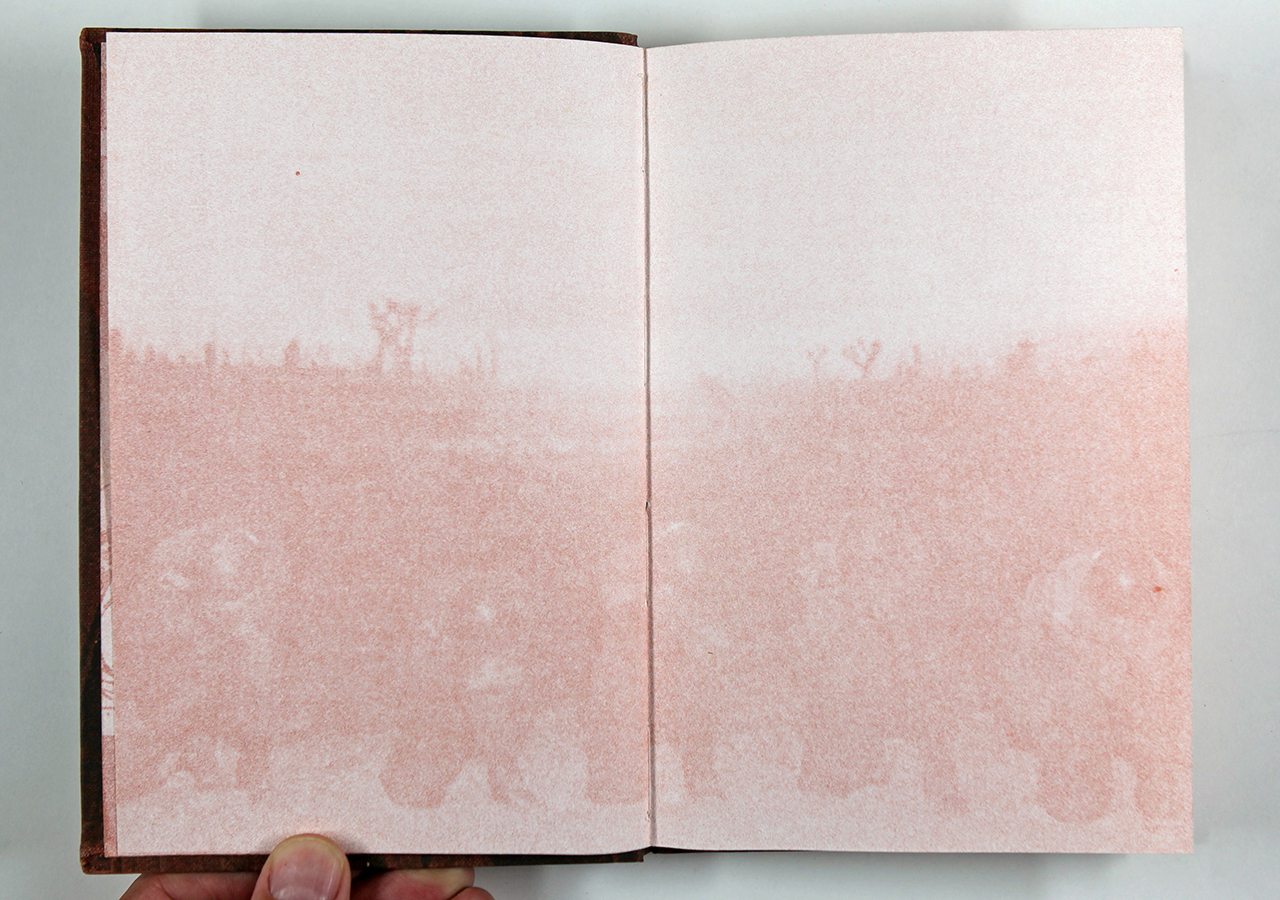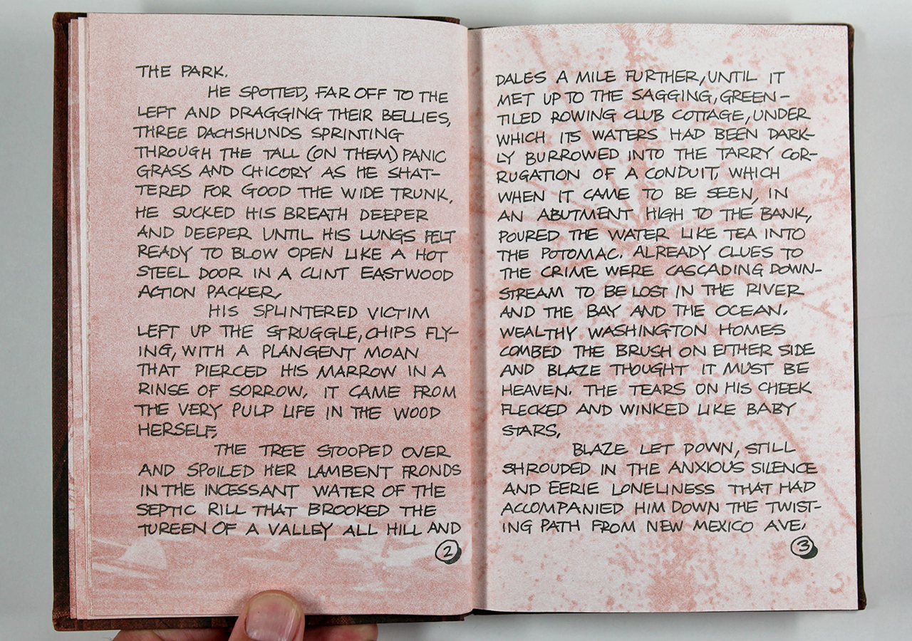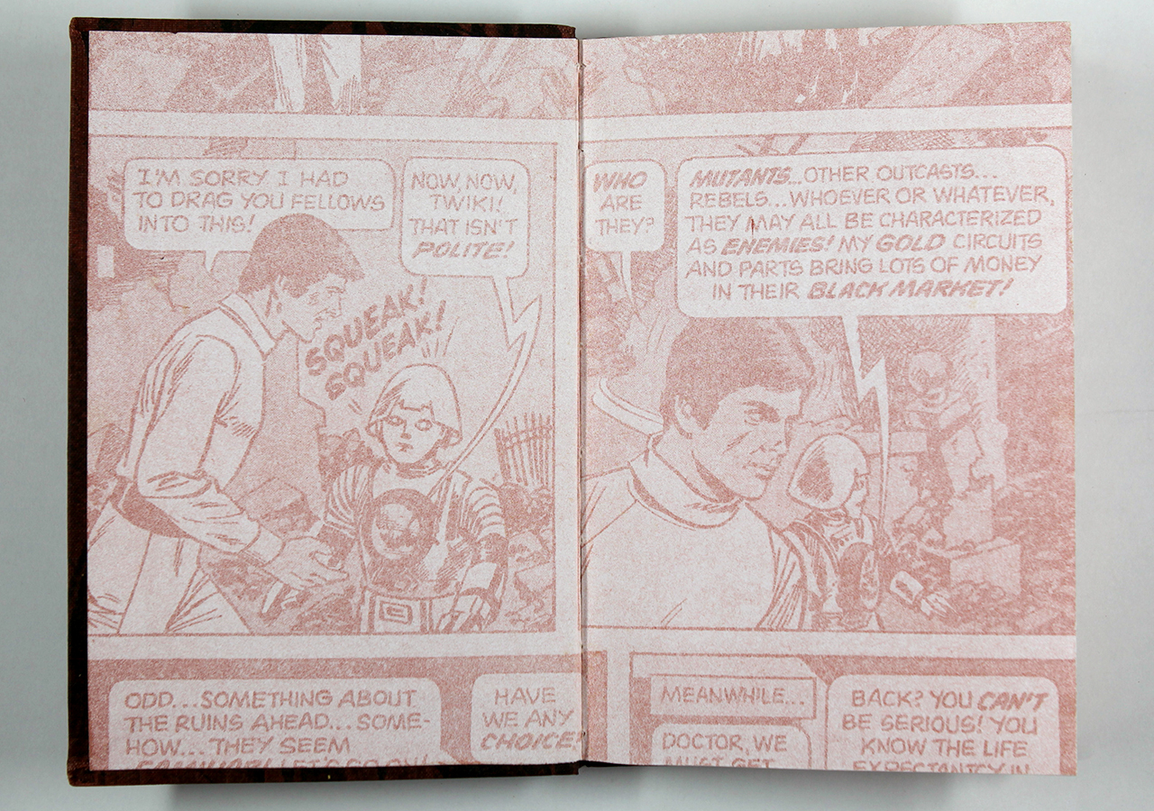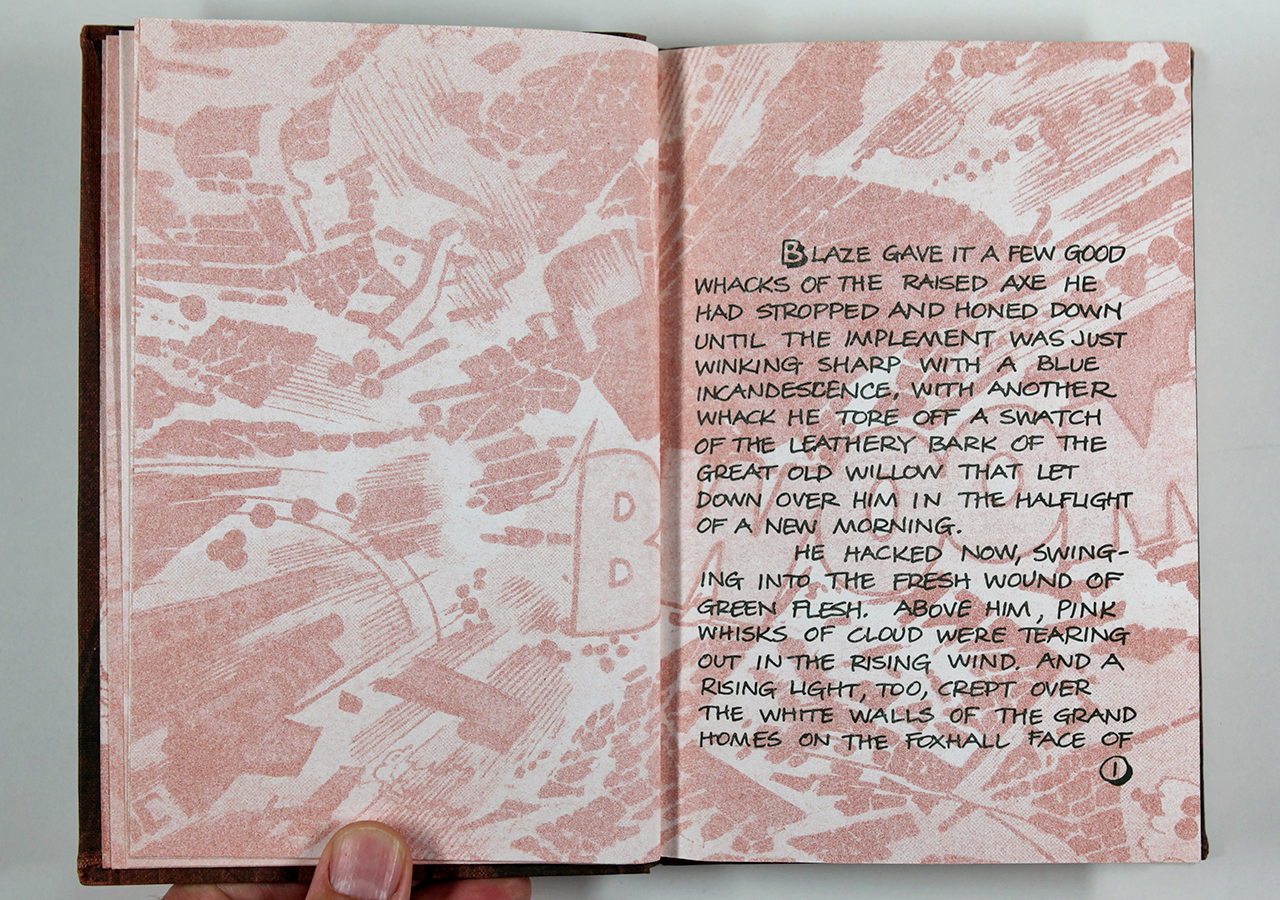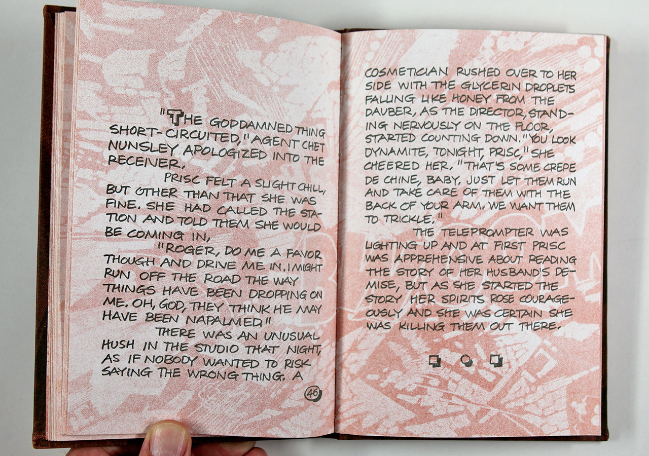 The Rusty Plate was a book written by Tim Ahern, an old friend of mine. Tim wrote the text, a dark yet strangely humorous story about nuclear meltdowns á la Three Mile Island (which had happened not long before). Taking a cue from the text, I designed the book so that it looked a little like a comic book (I hand-lettered the text throughout) and put images from U.S. Government nuclear testing from the fifties behind the text and as the end sheets. I silkscreened an image of willow leaves on the rust colored book cloth fabric. I recorded on a small Nakamichi reel-to-reel tape recorder (way before there was an easy digital way of doing this) a sound track that was meant to play while the book was being read. The cassette tape was made to be attached to the front cover of the book and the cassette case had a matching willow leaf pattern that I also silk-screened on there.