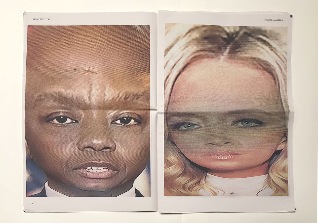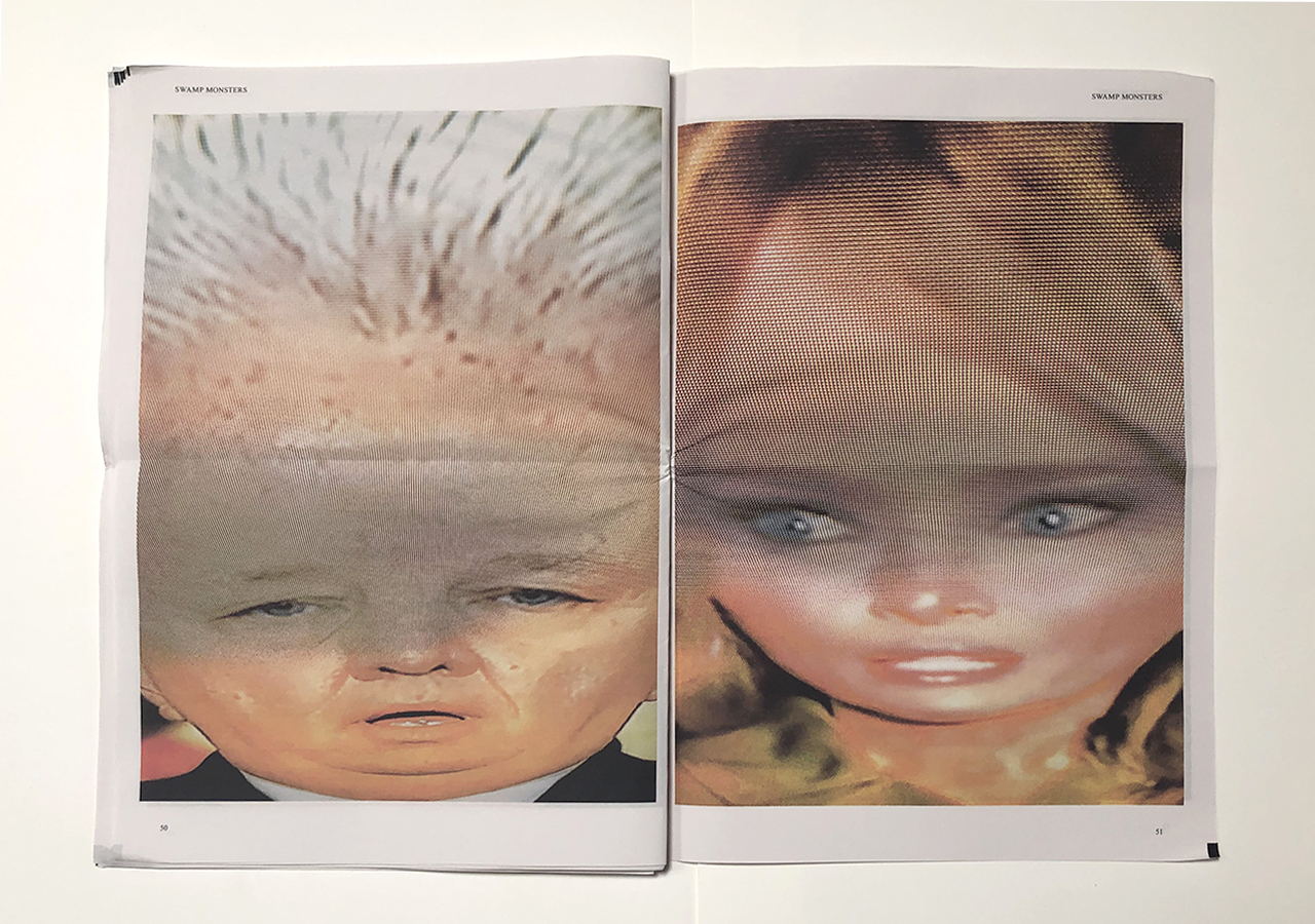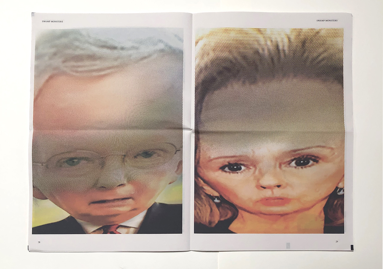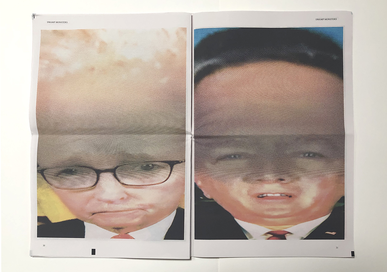 The Ice Plant (Los Angeles) and Spaceheater Editions (Tucson) announced the co-publication of Swamp Monsters on September 21, 2020, just three and a half weeks after these photographs from the 2020 Republican National Convention were taken. Swamp Monsters is a limited newsprint edition of 666 copies and commemorates the historically frightful 2020 Republican National Convention (August 24-27, 2020) with a series of photographs made by Philip Zimmermann as the spectacle unfolded on the television screen. This rogue's gallery of hideous video portraits was printed in Paris, France by printnewspaper.com in full color in an unbound tabloid newspaper format. Many thanks to Clif Meador of the Studio of Exhaustion for suggesting the title.