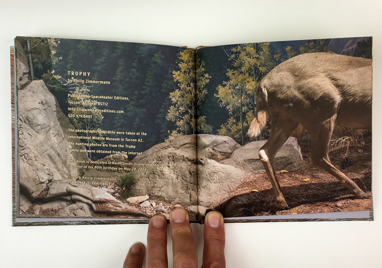 TROPHY is a reaction to the current social and political state of the United States of America and the criminal and immoral administration that currently wields power in our country. Although superficially the subject matter is the cruelty of the Trump sons, their activities are an indicator of the worldview of the morally bankrupt family and administration of Donald J. Trump. The photographs of the animal dioramas and fur details were taken at the International Wildlife Museum in Tucson, AZ. The big-game trophy photographs of Donald J. Trump Jr. and Erik Trump were obtained from the internet, presumably Trump family travel and safari photographs, and have no photographer attribution.