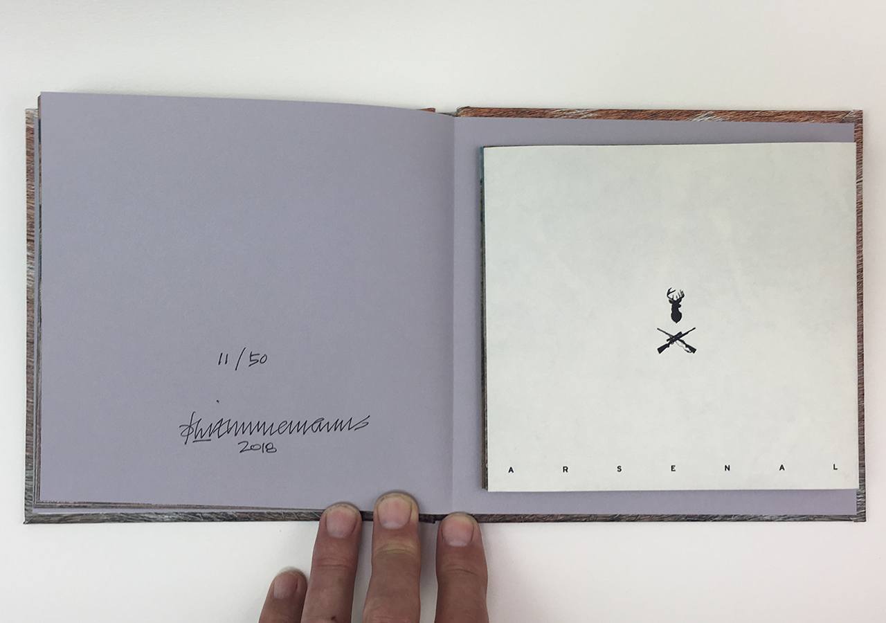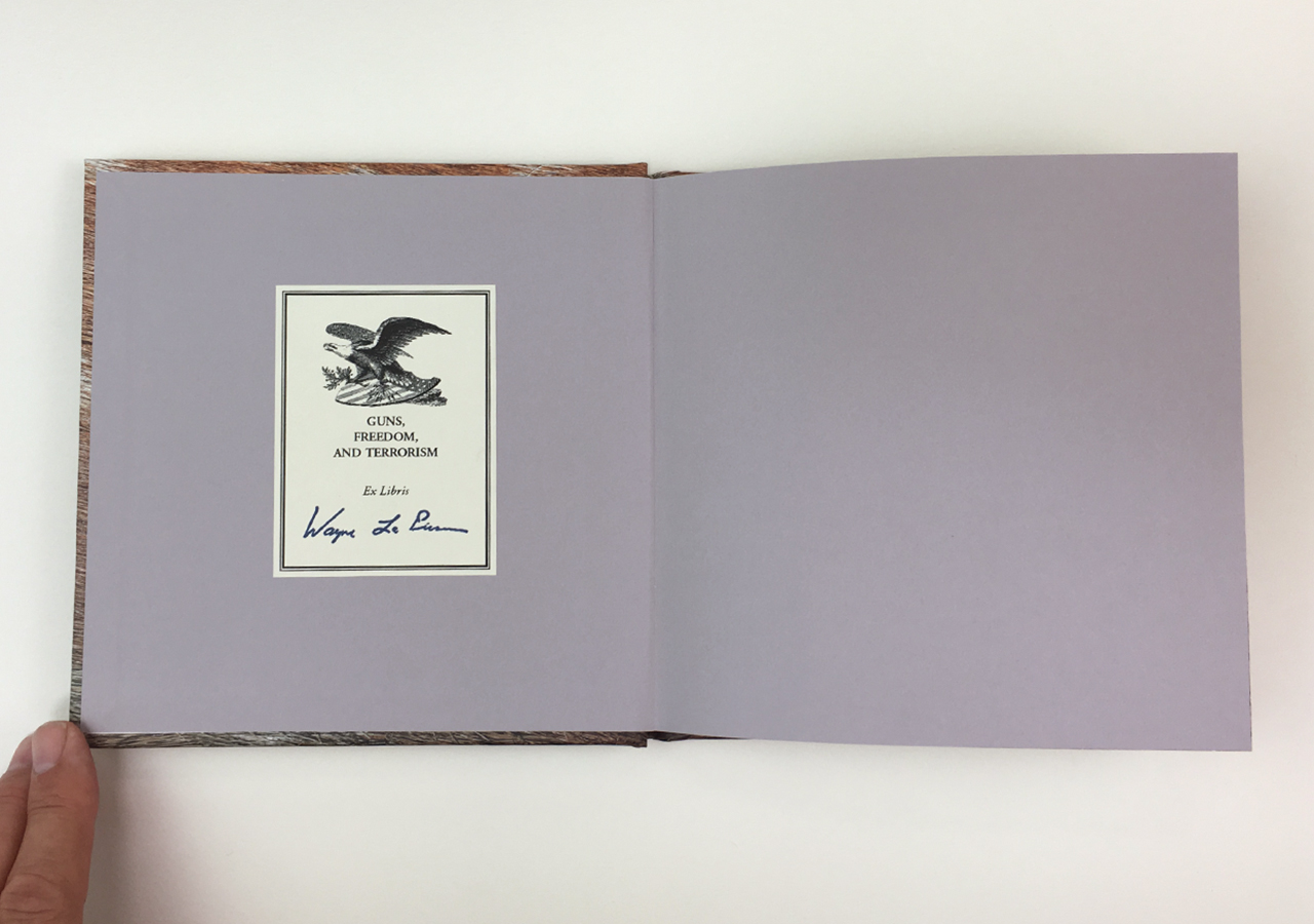 This edition was printed in an edition of fifty and they are signed and numbered. The inside text block and cover were printed by HP Indigo digital printing on archival Mohawk Superfine. The Ex Libris book plate in the front, and the accordion 'arsenal' section at the rear of the book, were printed by archival inkjet pigment on acid-free French Paper Co. paper. The book dimensions are 7" x 7" x 5/8" (17.75cm x 17.75cm x 1.5cm). The book has 68 pages, and is hardcover bound, and is priced at $125.